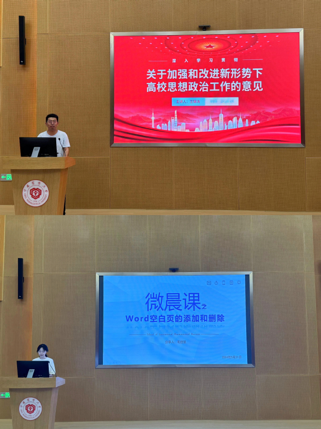 本次“微晨课”由辅导员王锦涛老师主讲,深入解读了《关于加强和改进新形势下高校思想政治工作的意见》。他紧扣文件出台的重要意义和总体要求,围绕“如何加强思想理论教育和价值引领,怎样更好地发挥哲学社会科学的育人功能,如何推动高校思想政治工作的改革创新,如何加强和改善党对高校的领导”这几个问题,生动阐述了新形势下改进高校思想政治工作的意义和重要性,并结合六合论坛 的专业特色强调加强哲学社会科学学科体系建设,切实发挥其在育人中的重要作用。接着,学生助理毛佳慧开展“技能加油站”Word相关操作技巧分享,以进一步提升辅导员与学生助理的工作技能。