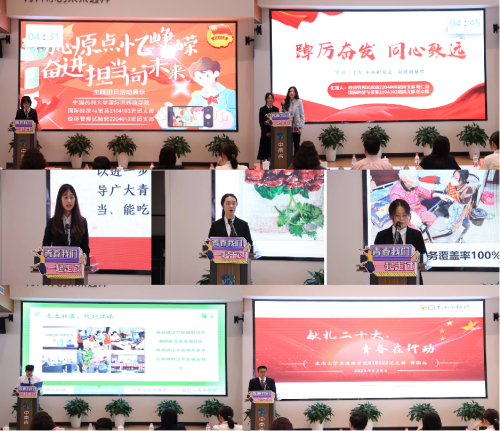 展示过程中,我校国际医药商学院5支队伍分别以《继坚韧不拔之勇 创笃行不怠之功》《信仰点亮青春 笃行成就梦想》《青春向党沐风雨 杨帆追梦砥砺行》《初心原点忆峥嵘 担当奋进向未来》《踔厉奋发 同心致远》为题进行展示,东南大学吴健雄六合论坛 以《献礼二十大,青春在行动》为题、南京航空航天大学计算机科学与技术六合论坛 以《垃圾+创意=宝藏”改造计划》为题、河海大学大禹六合论坛 以《少年奋进无遗力,继往开来义不辞》为题进行分享。各支部立足青年视角,以微团课、手绘长卷、实践服务、视频创作、情景剧演绎、参观红色教育基地等丰富多彩的形式,生动阐述了新时代青年要发扬“功成不必在我、功成必定有我”的责任感和使命感,践行“请党放心,强国有我”的铮铮誓言和行动自觉,现场气氛热烈、掌声不断。