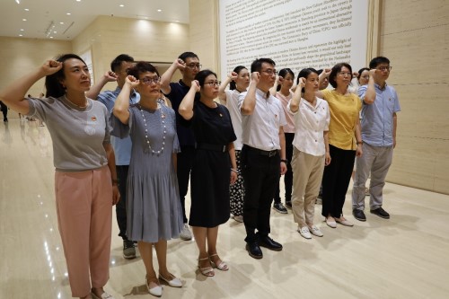 在纪念馆尾厅,全体党员重温了入党誓词,铿锵有力的声音传达出了身为共产党员的自豪感和使命感。