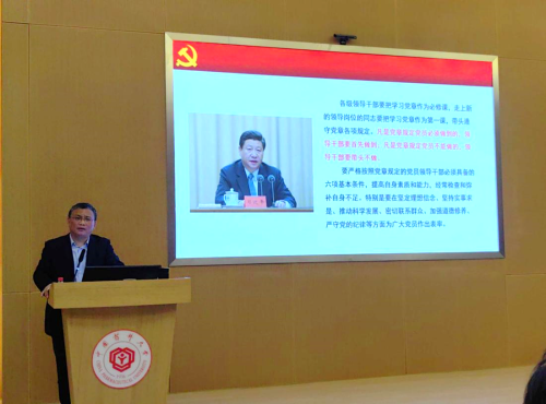会上,陶林教授以“学习2022新党章,做合格的党员为题,围绕党章的历史沿革、新时代党章的创新成果以及历史人物舍己为国的伟大精神等内容,深入浅出地为同学们进行讲解,同时通过新旧党章的对比为大家详细地阐述了新内容的由来与意义。陶教授强调,党章是根本大法,是全体党员言行的总遵循,新时代的师生应学好党章,在学习工作和生活中时刻以党章的高要求、高标准严格约束自己的行为规范,做能担当民族复兴重任的时代新人。