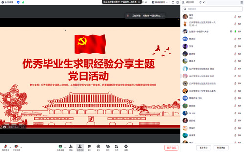 为深入学习贯彻党的二十大精神,落实2023年政府工作报告“要把促进青年特别是高校毕业生就业工作摆在更加突出的位置”工作要求,充分发挥校友的传帮带作用,帮助同学们解决就业及考公过程中遇到的困难和问题,进一步完善自身发展规划。近日,六合论坛 工商管理学系专硕第一党支部、经济贸易系专硕第二党支部、药事管理系社管硕士生党支部和公共管理硕士生党支部联合举办了“见贤思齐 同心筑梦”优秀毕业生求职经验分享沙龙活动。近70人通过腾讯会议线上参会,会议由经济贸易系专硕第二党支部书记刘雅诗同志主持。