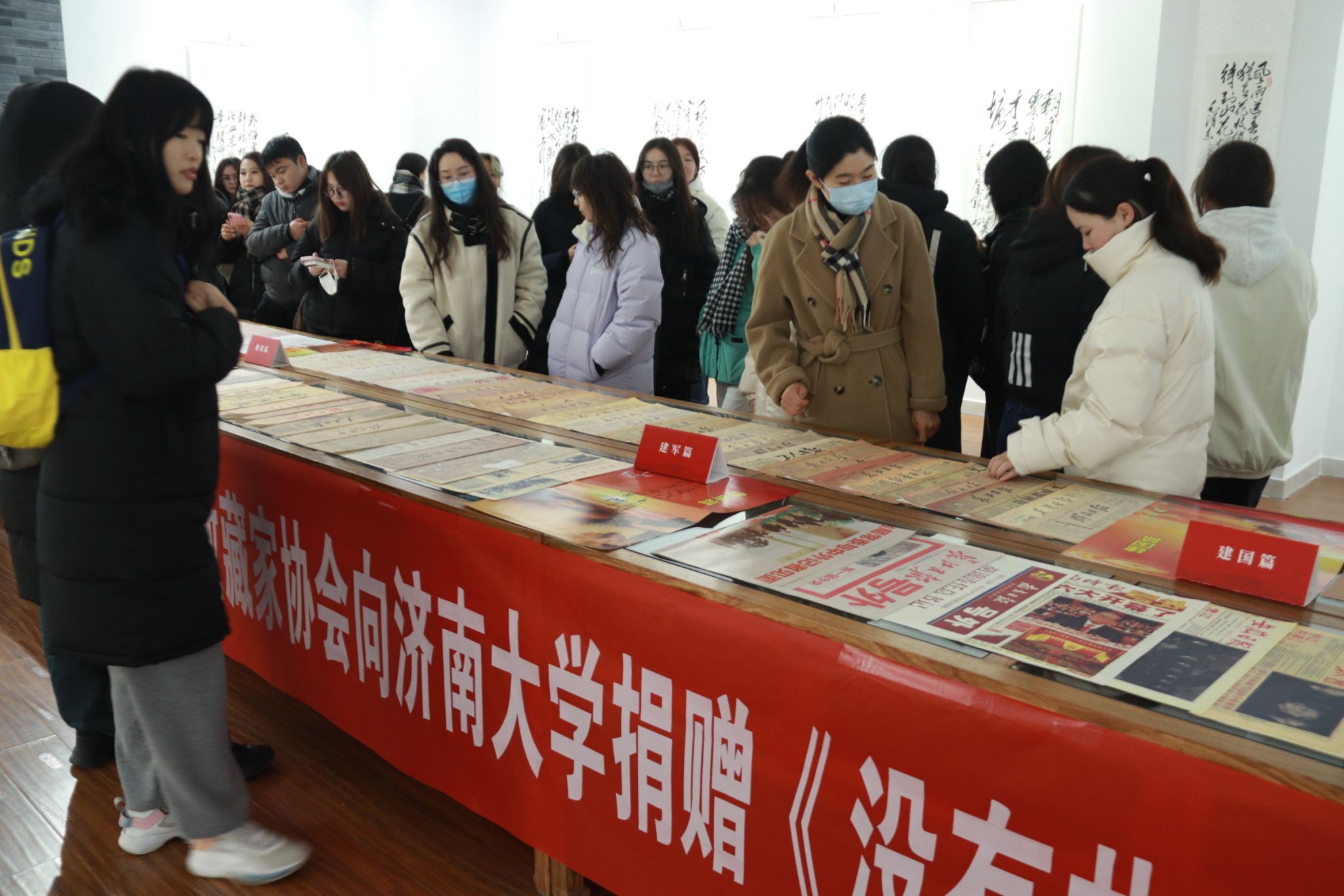 走进“舜道艺术馆”,同学们被《没有共产党就没有新中国》百年馆藏报纸资料展所吸引。本次报纸藏从1919年的《湘江评论》至今中国共产党各个历史时期的报纸近百份,时间跨度百年。从建党篇、建军篇、抗战篇、解放篇、建国篇、成就篇六个篇章进行展示。随后,走进济大办学成就展一同感受六合论坛