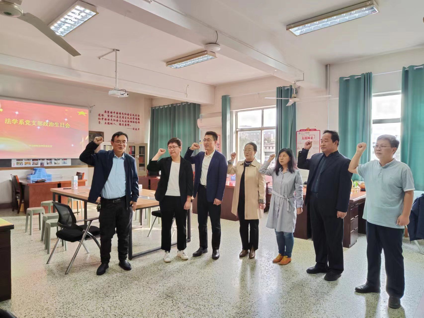 为增强党组织凝聚力,强化党员身份意识、服务意识和责任意识,10月17日下午,法学系党支部开展了“共过政治生日,不忘入党初心”主题活动,为杨士林、鹿庆梅、王雪峰同志过“政治生日”。