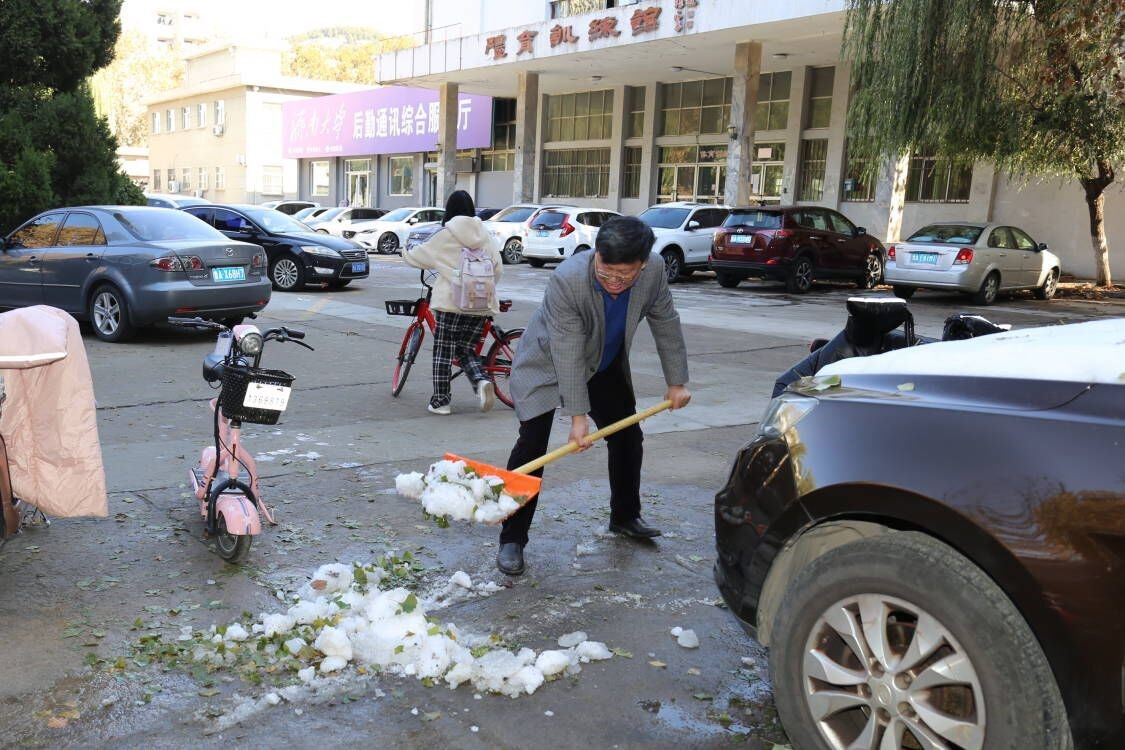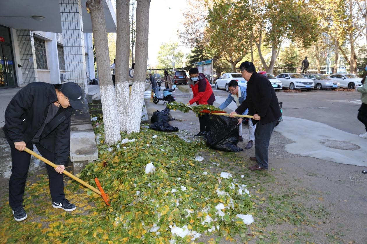 由于济南首场大雪造成校园树枝断落,落叶成堆,急待清理。为全面清理这些问题,保护校园内的环境卫生,行政党支部发动党员教师于11月12日上午在三教门前广场开展了美化校园环境志愿服务活动。