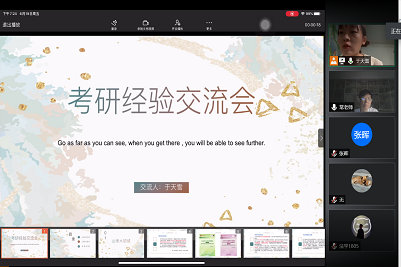 第二位为备考同学做考研交流的是于天雪同学。于天雪同学以优异成绩考上了山东师范大学的思想政治教育专业,她首先为大家推荐了她所使用的考研教材。在专业课的准备上,她建议同学们熟记热门话题,梳理框架、构建知识体系,在专业课题型设置上,于天雪同学建议同学们多读马克思主义原著。针对复试部分,她主要讲解了网络复试的注意事项,并针对复试内容给出了自己的建议。最后,于天雪同学结合自己备考的经验提出效率、兴趣、计划和心态上的一些经验。