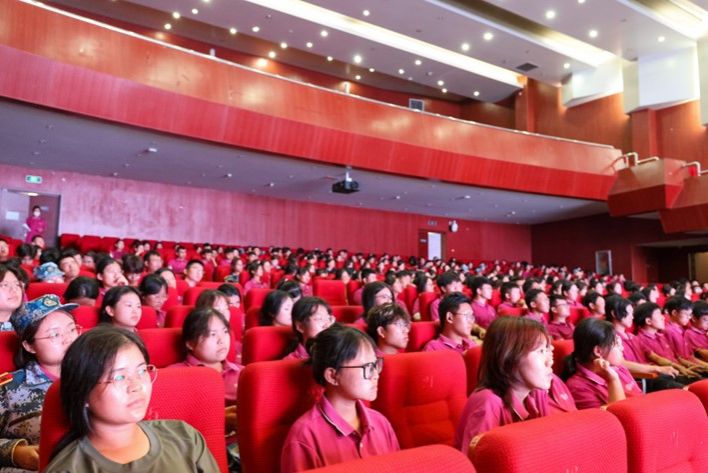 大礼堂举行2023级新生入学教育第四讲。学生工作办公室主任黄茜、团委书记刘晓娟、教学管理办公室主任丁梁及全体辅导员出席本次活动,2023级新生共同参加。活动由2023级辅导员房仕琪主持。