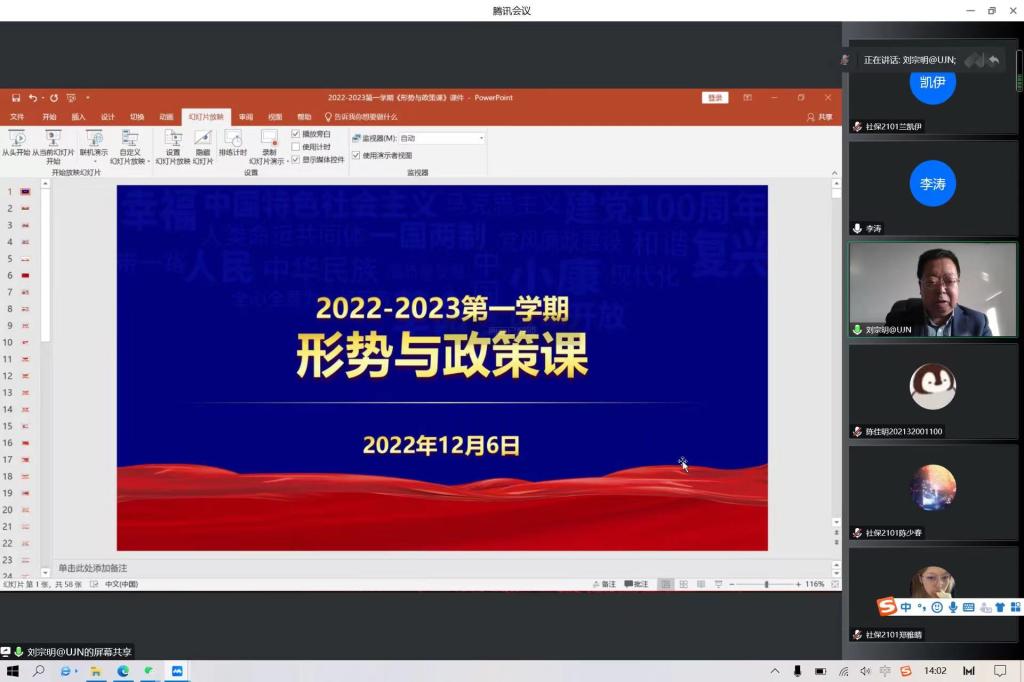 2021级劳动与社会保障专业学生讲授2022至2023学年第一学期形势与政策课,本次课程采用腾讯会议线上方式进行,六合论坛