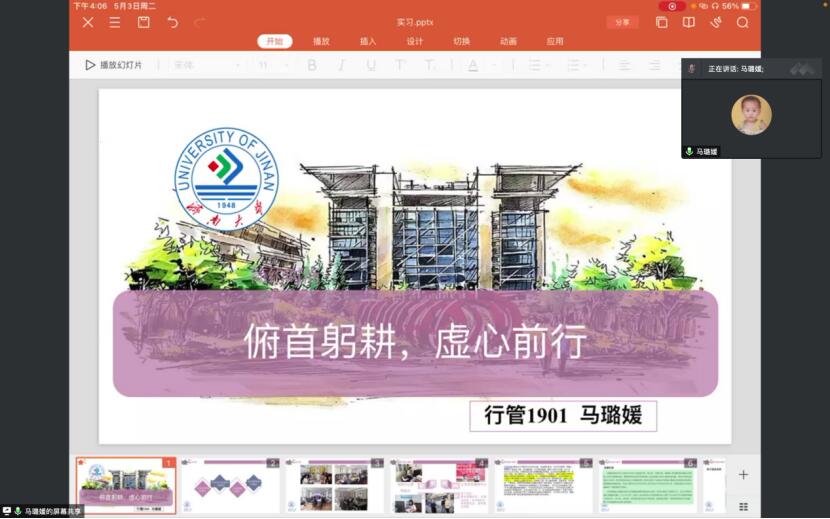 随后,2019级马璐媛、任荟芸两位同学结合从自身经历分享了自己的认识实习体会。马璐媛以自己在泺源街道党政办公室的实习经历为例,从街道治理的角度出发,讲述了实习中的感悟和思考,建议同学们在学好专业知识的同时,做到理论和实践相统一,知中有行,知行合一。