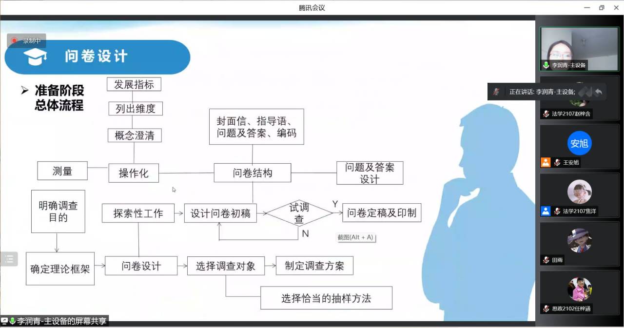 首先,李润青学姐从“什么是调查研究”一图引入主题,进而针对调查研究中“问卷设计”“数据处理”两个大方向来讲述,具体的讲解了“问卷设计的流程”“调查的对象”“问卷适用方法”“数据录入”以及“数据清理”等问题,并向同学们展示了各种统计软件的实际操作方法。不仅开拓了同学们的调查研究视野,还对同学们的研究项目进行了规范性的改善与提升。