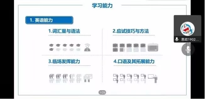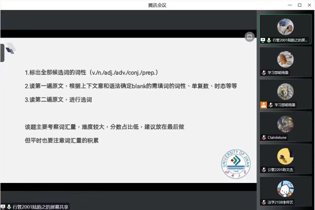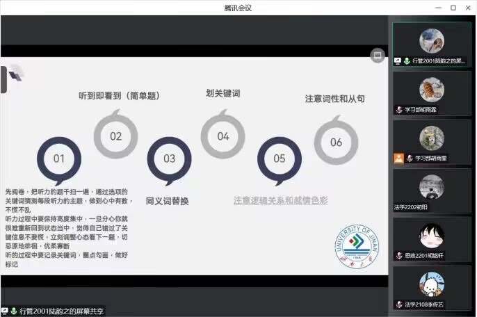 举办英语四六级经验分享交流会,思政1902班侯广雨同学和行管2001班陆韵之同学在线上分享了自己备考四六级的经验。