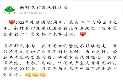 2022年4月21日至24日,新野农村发展促进会以“喜迎二十大,奋进新时代”为主题开展了学习党领导下的百年青年运动史知识竞赛。本次知识竞赛以线上问卷的形式进行,同学们通过网络进行在线答题。