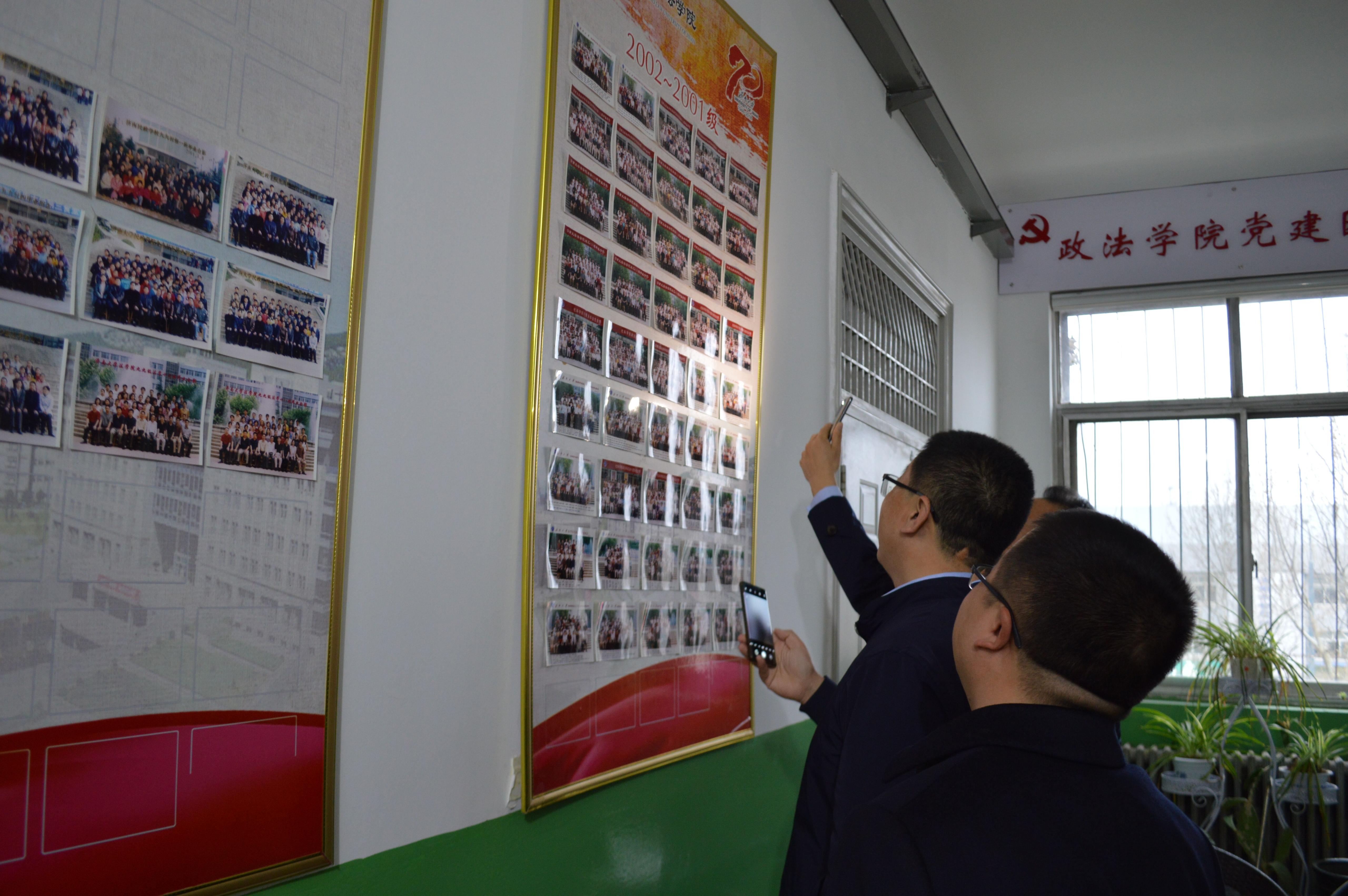 党建园地,于飞校友在校友墙上找到自己班级合影,回忆着在六合论坛