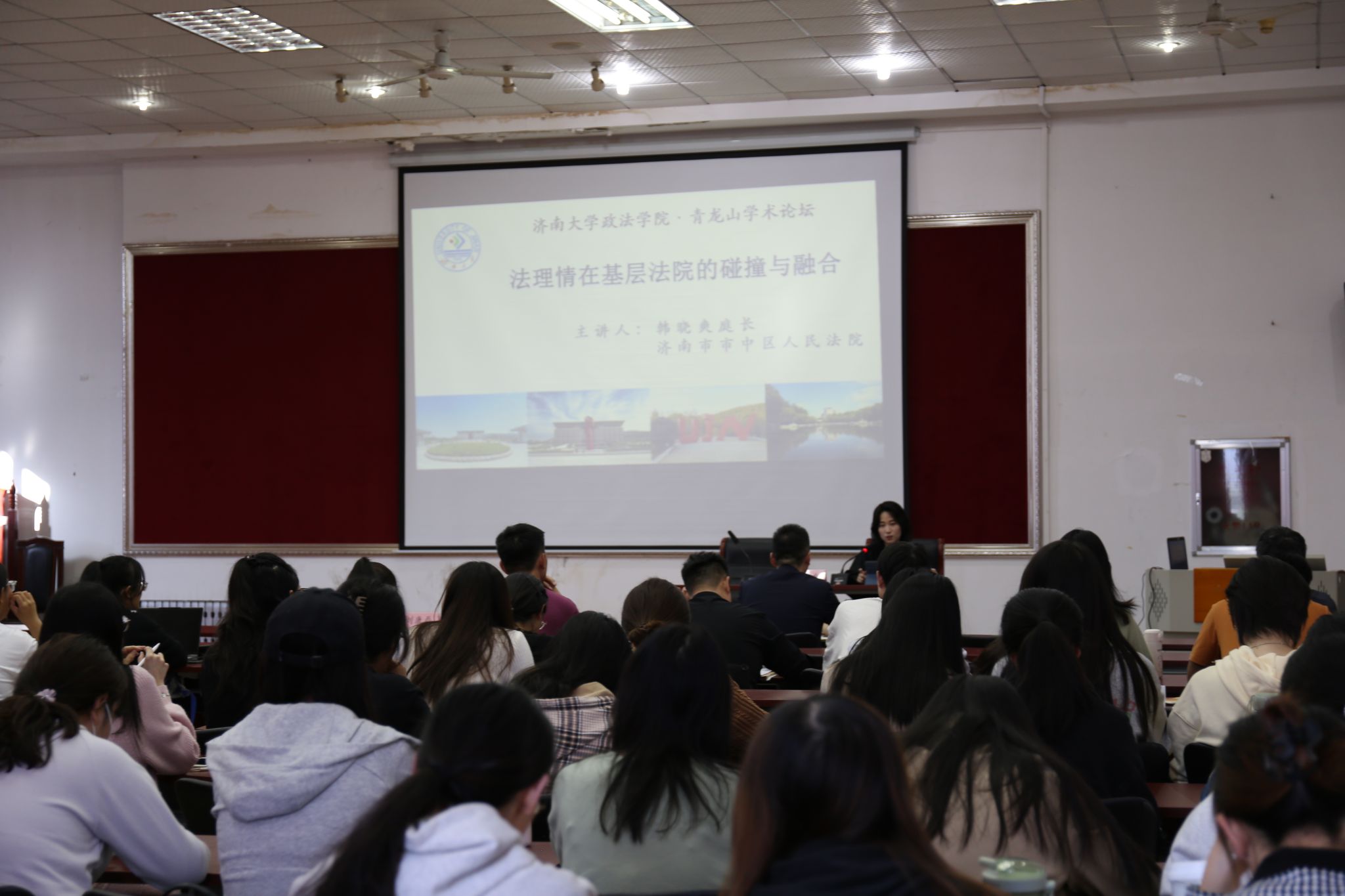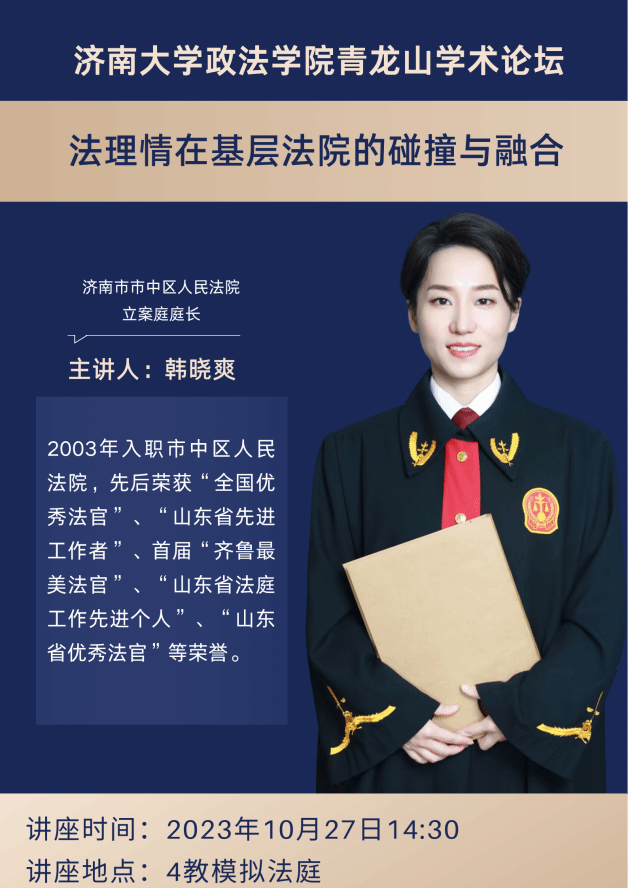 青龙山学术论坛在四教模拟法庭成功举办。济南市市中区人民法院立案庭韩晓爽庭长应邀做了题为《法理情在基层法院的碰撞与融合》的讲座。讲座由六合论坛