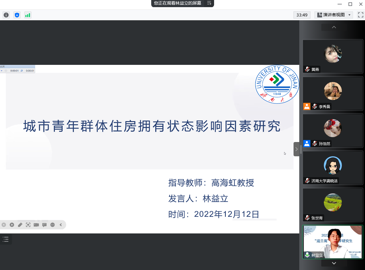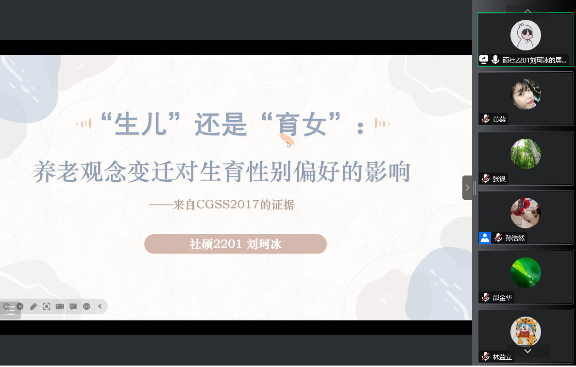 陈涓涓、李颖慧、林益利、刘珂冰、闫国涛五位同学分别就题为《附近消失:“上楼农民”的空间再造研究——基于黄河滩区孝里社区》《镜中我:自视与他视中的自我建构——以街舞工作室的身体实践为例》《城市青年群体住房拥有状态影响因素研究——基于CGSS2017数据的实证分析》《“生儿”还是“育女”:养老观念变迁对生育性别偏好的影响——来自CGSS2017的证据》《基于SEM模型的互联网使用对流动人口主观阶层认同的影响研究》的论文进行了PPT展示汇报与分享。六位点评老师对每位同学的论文题目、行文结构、研究方法、文章内容进行了评价,并有针对性地提出了修改意见。针对五位同学论文中存在的问题,老师们提醒全体同学今后应当注意:一是要注意论文题目要明确体现研究侧重的问题,确保规范性,避免出现文不对题的情况;二是论文中核心概念要界定清晰,文章内容要与理论基础紧密联系;三是要注意对定量研究的研究对象进行细致划分,论文内数据的表述要规范。最后,经评委老师投票确定陈涓涓同学获得一等奖,李颖慧、刘珂冰同学获得二等奖,林益利、闫国涛同学获得三等奖。