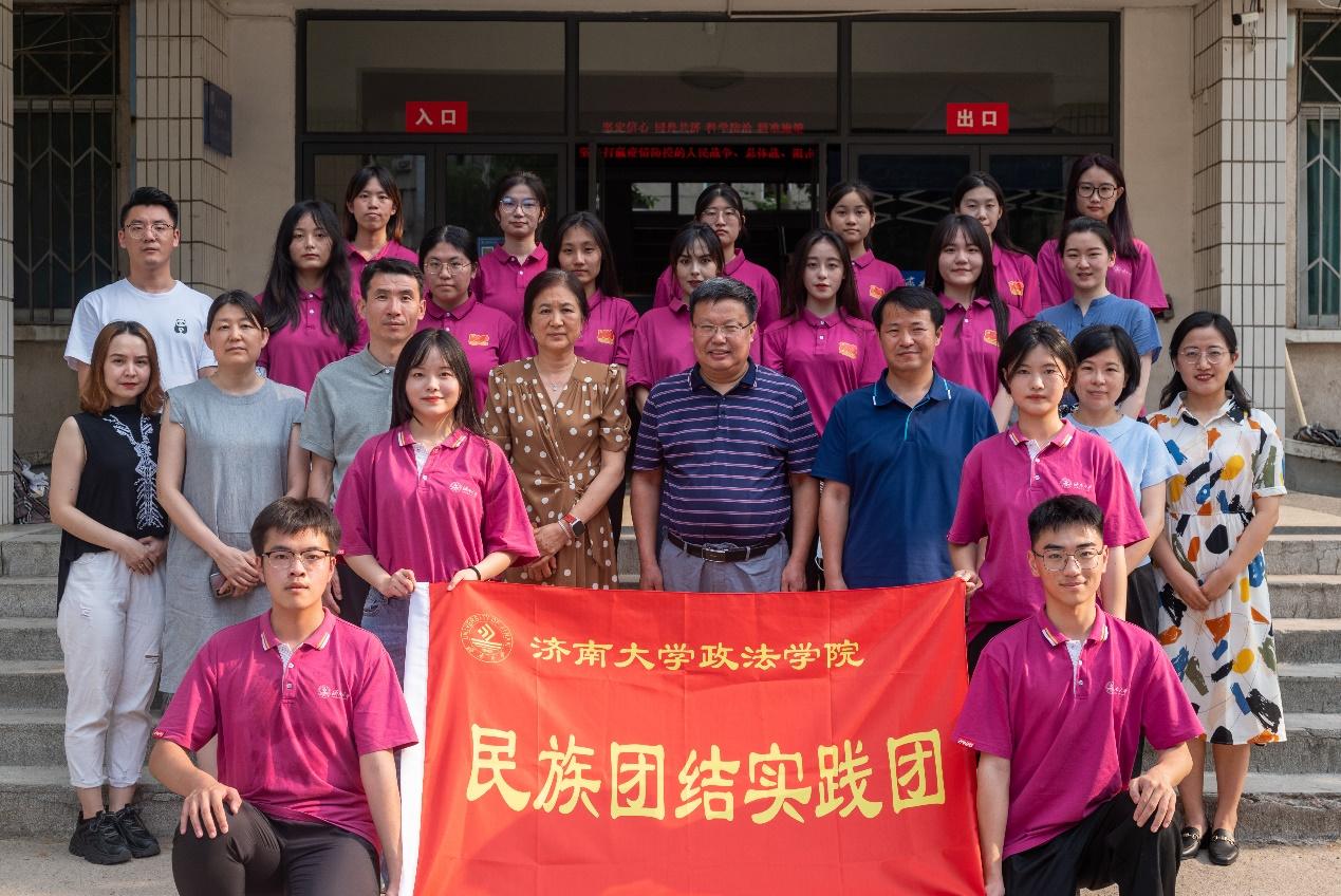 党委书记徐庆国,院长高功敬,正处级组织员国迎春,党委副书记、副院长李涛,院长助理朱丽敏、李秀凤,学办主任黄茜,团委书记刘晓娟,辅导员迪妮尕尔·艾尔夏提、赵朔、宗琪等老师同“青马工程”暑期实践团全体成员合影。
