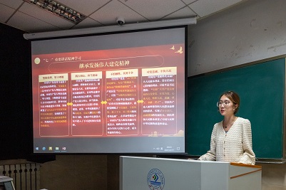 第十二期“青马工程”学生骨干培训班团支书杨舒雯带领全体青马班学员学习习近平总书记“七一”重要讲话精神。杨舒雯同学从“全面小康献礼建党百年”、“继承发扬伟大建党精神”、“人民力量助力民族复兴”、“寄语青年奔赴美好未来”四个维度作为切入点,帮助同学们解读了总书记讲话的深刻内涵。在讲述中,她表示,全面建成小康社会不是终点,而是我们新生活的起点,学员们应当充分领悟并继承发扬“坚持真理、坚守理想,践行初心、担当使命,不怕牺牲、英勇斗争,对党忠诚、不负人民”的伟大建党精神,以实际行动,淬炼新时代青春本色。同时,杨舒雯同学结合电视剧《觉醒年代》向同学们进一步阐述了作为青年该如何发挥自身作用,提高思想觉悟,并呼吁大家珍惜当下,不浪费一分一秒,积极投入到理论学习和实践锻炼中。