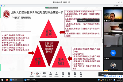 陆杰华教授结合自己的研究分析了新时代中国的老龄化新国情,并将其归纳为三大突出特点:不可逆转、不可复制、不容乐观。同时,梳理了应对人口老龄化的政策体系建设及其主要成效,提出人口老龄化面临的“五大发展机遇”和存在的“四大主要优势”。陆杰华教授指出,应对人口老龄化的中长期战略规划体系要以养老服务体系为重要突破点。在交流提问环节,陆杰华教授对同学提出的养老保障体系制定的相关问题进行了详细解答,并就热点问题同与会师生进行了亲切的交流探讨。
