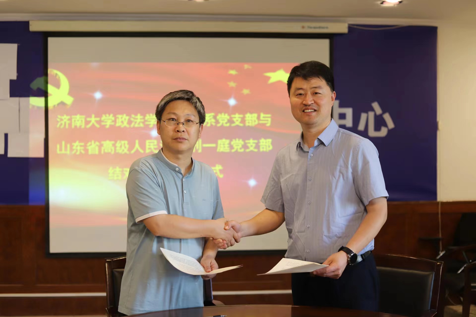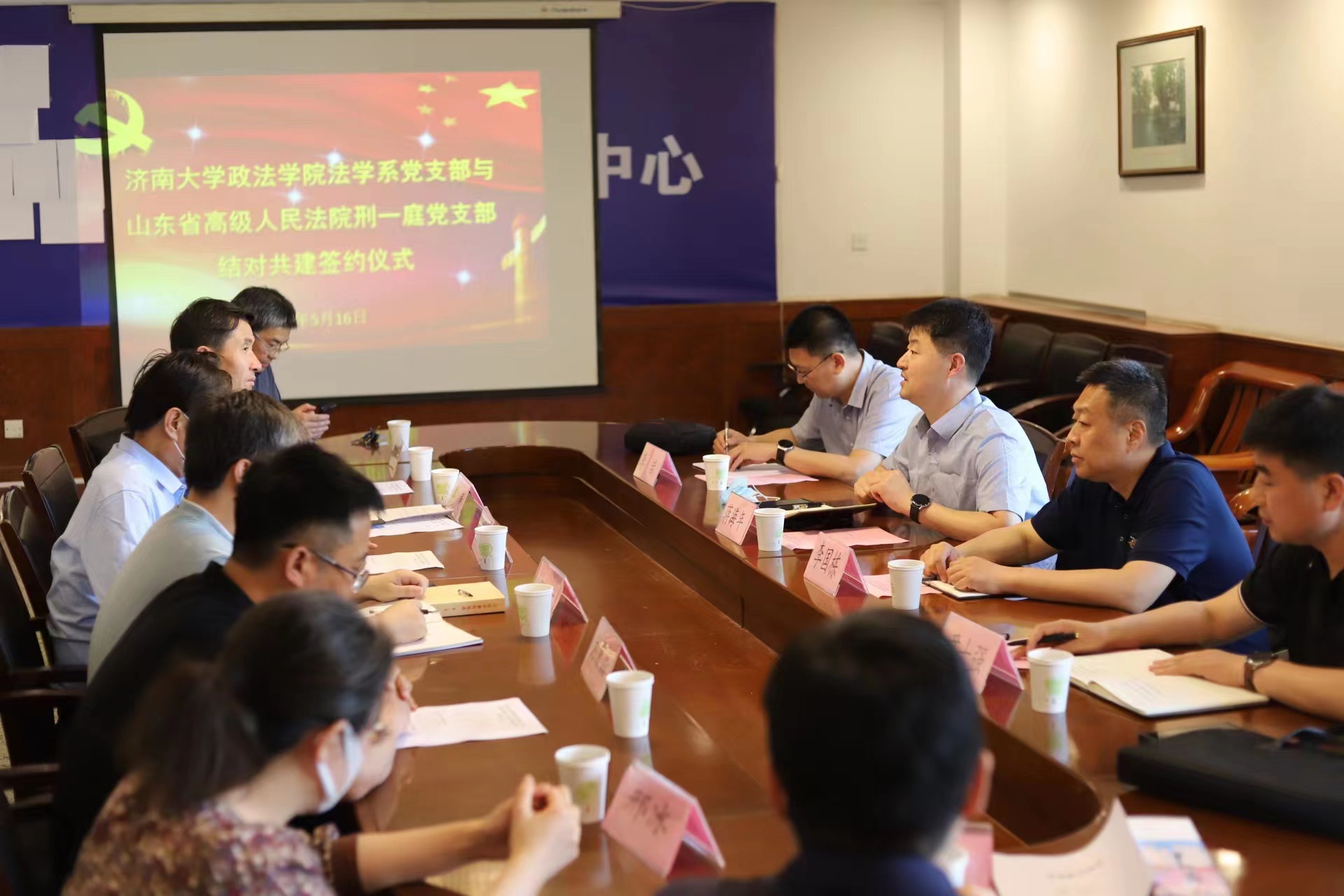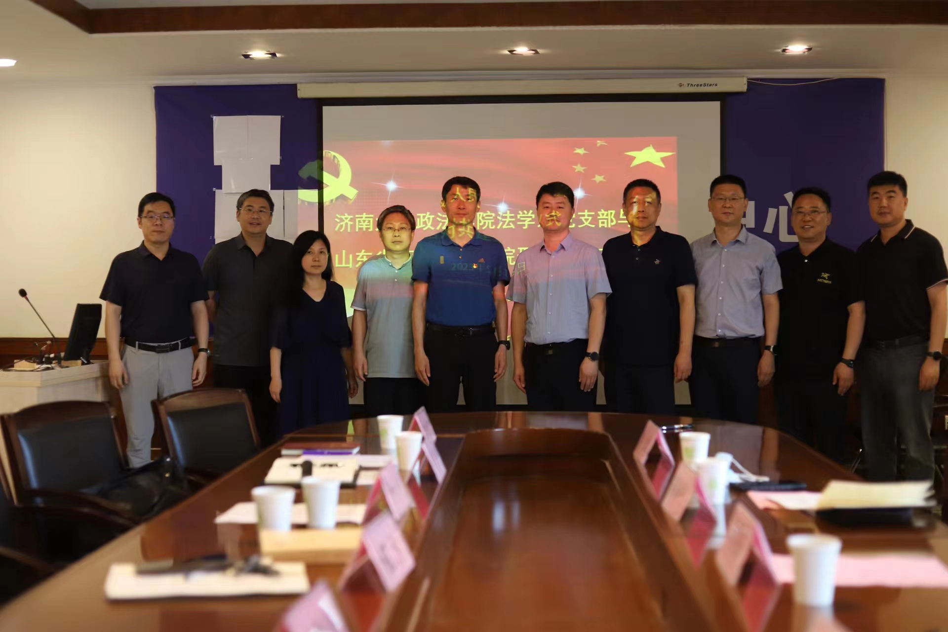 党委副书记李涛、法学系主任刘康磊、副主任陈强、法学系党支部书记程方、党员杨士林、苑敏、侯中华、齐晓霞、朱海波、邢冰等与山东省高级人民法院刑一庭党支部书记蒋海年、党支部委员李国栋、李岩、尹士强等参加活动并签订合作共建协议。