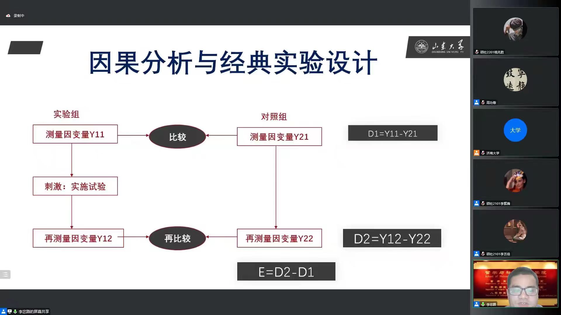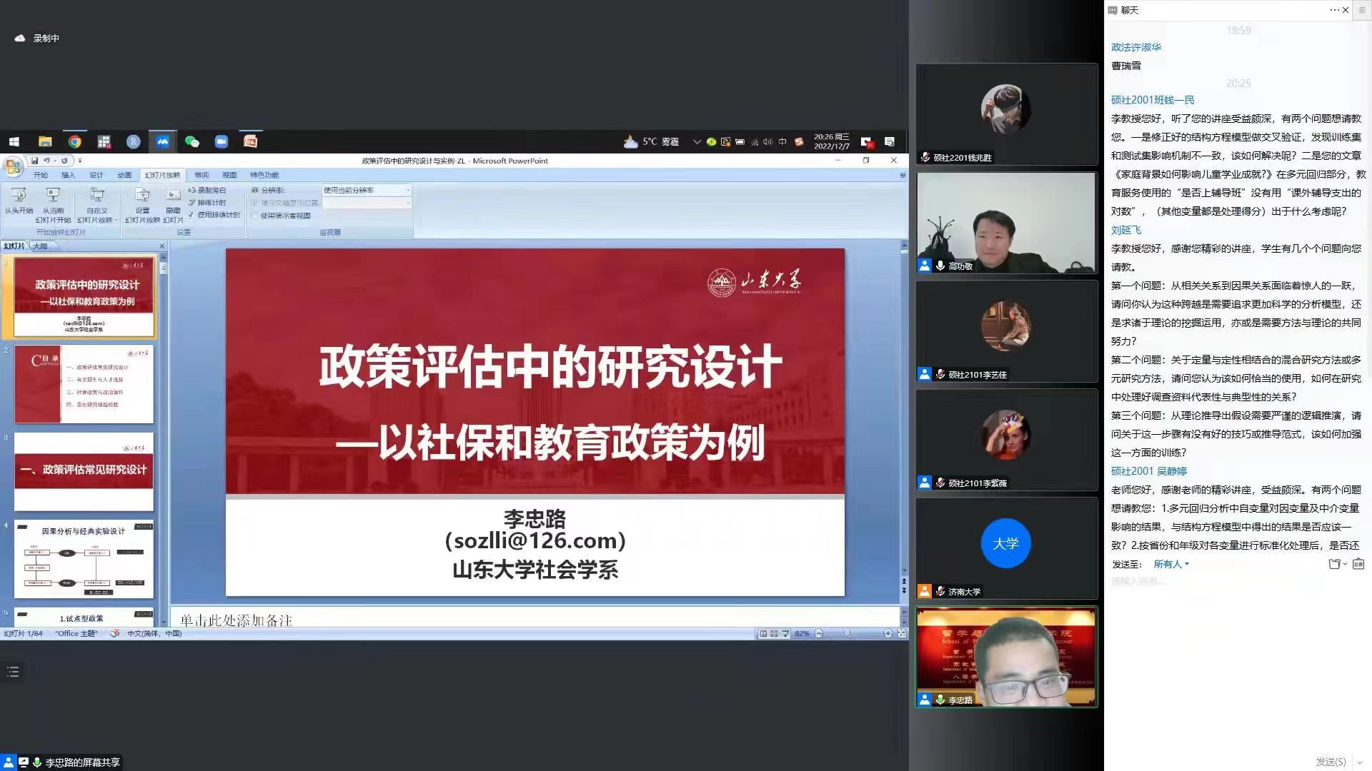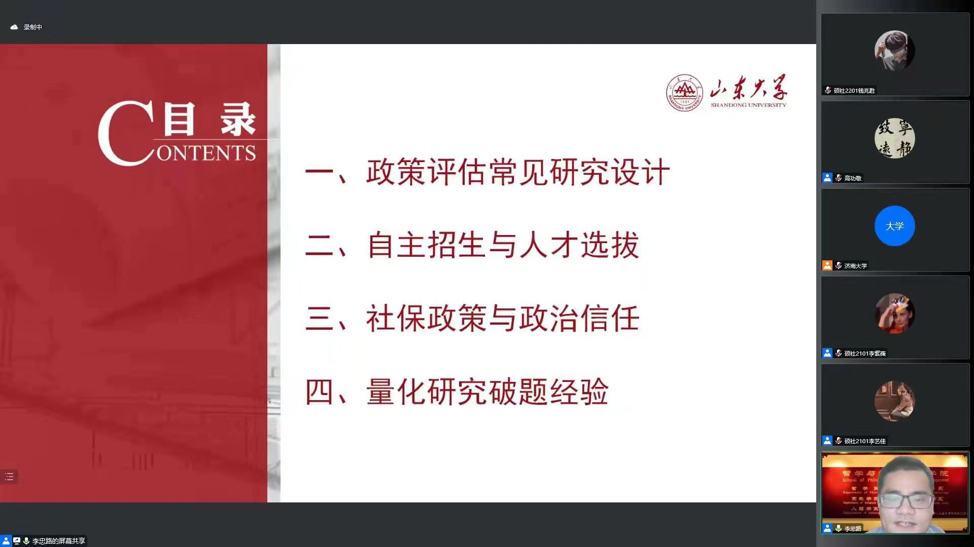 李忠路教授从常见的研究设计、政策评估的设计实例以及量化研究的破题经验三个方面展开阐述,首先为同学们推荐了双差分模型(DID)、断点回归设计(RDD)、工具变量、倾向价值匹配(PSM)及固定效应等方法,随后结合自主招生选拔政策、低保补助与政治信任、新农保与政治信任三个主题介绍了群体差异分析、伪双差模型(DID)的应用。最后,为同学们传授了量化研究的破题经验,鼓励同学们从群体差异、效应差异、被忽略的社会过程以及影响机制入手来展开研究。