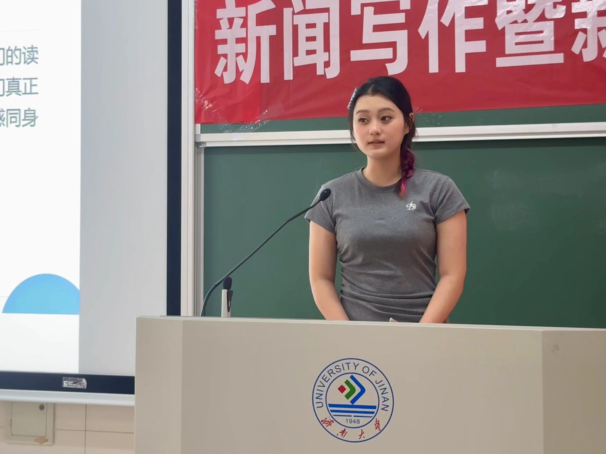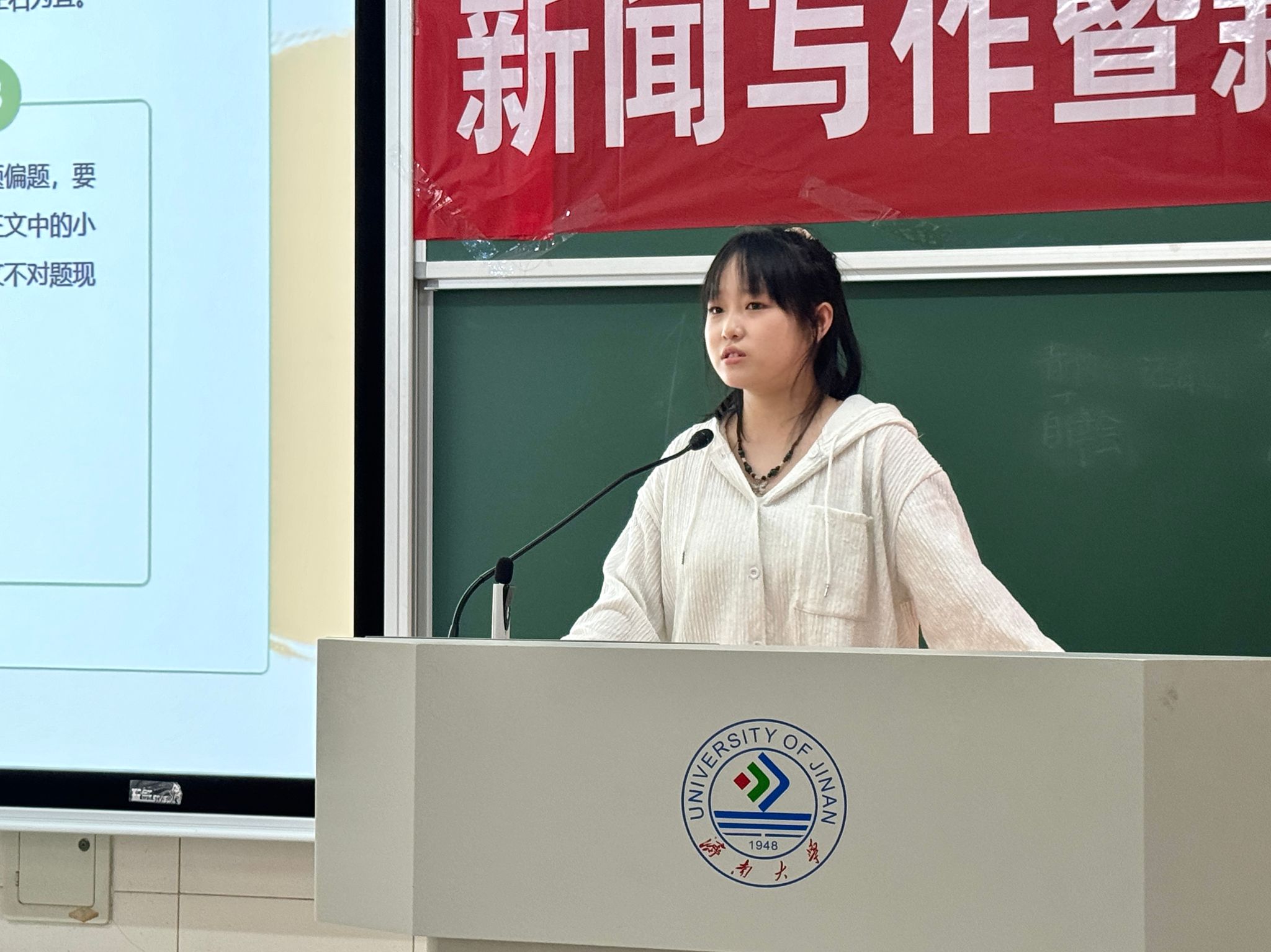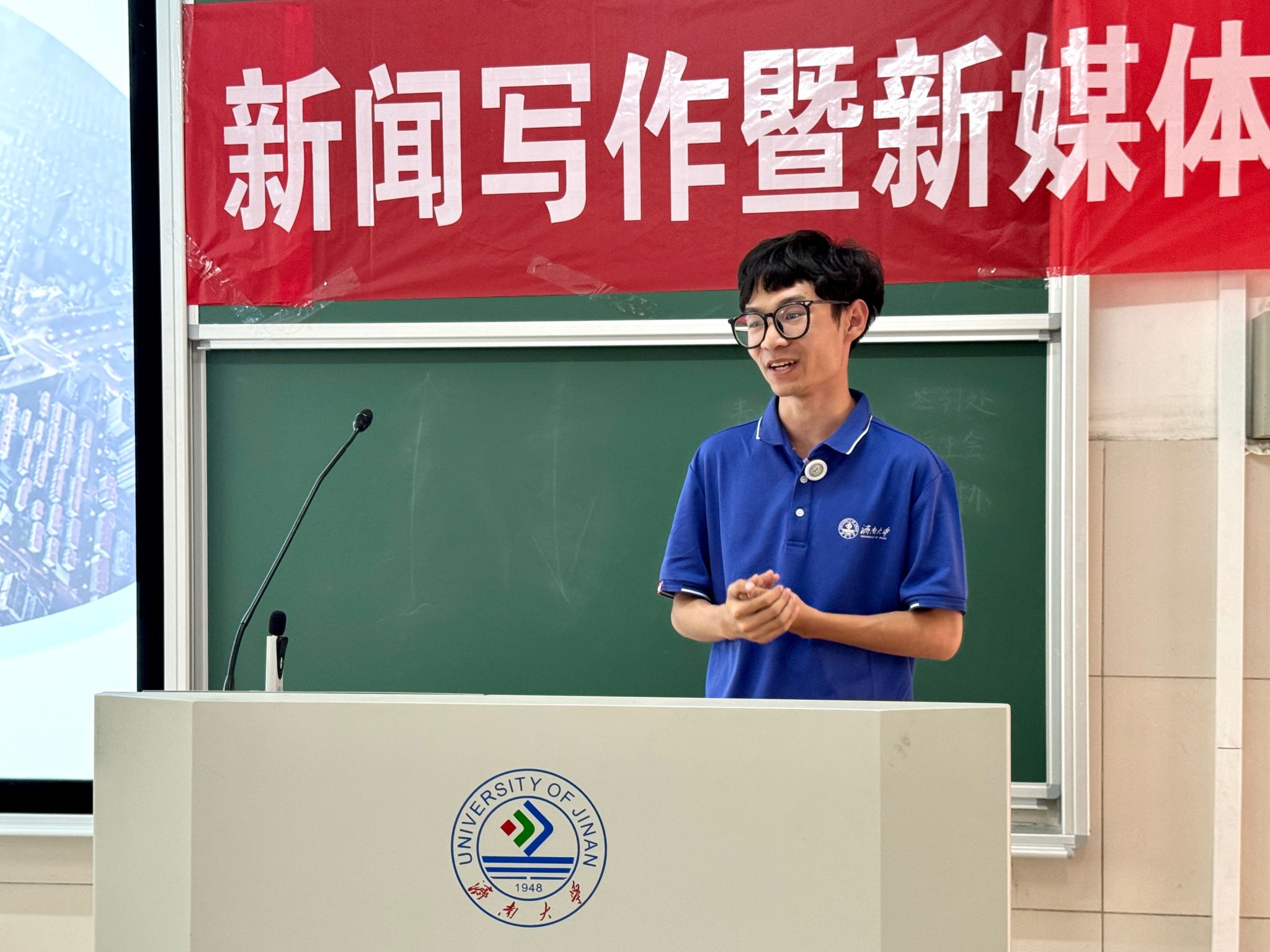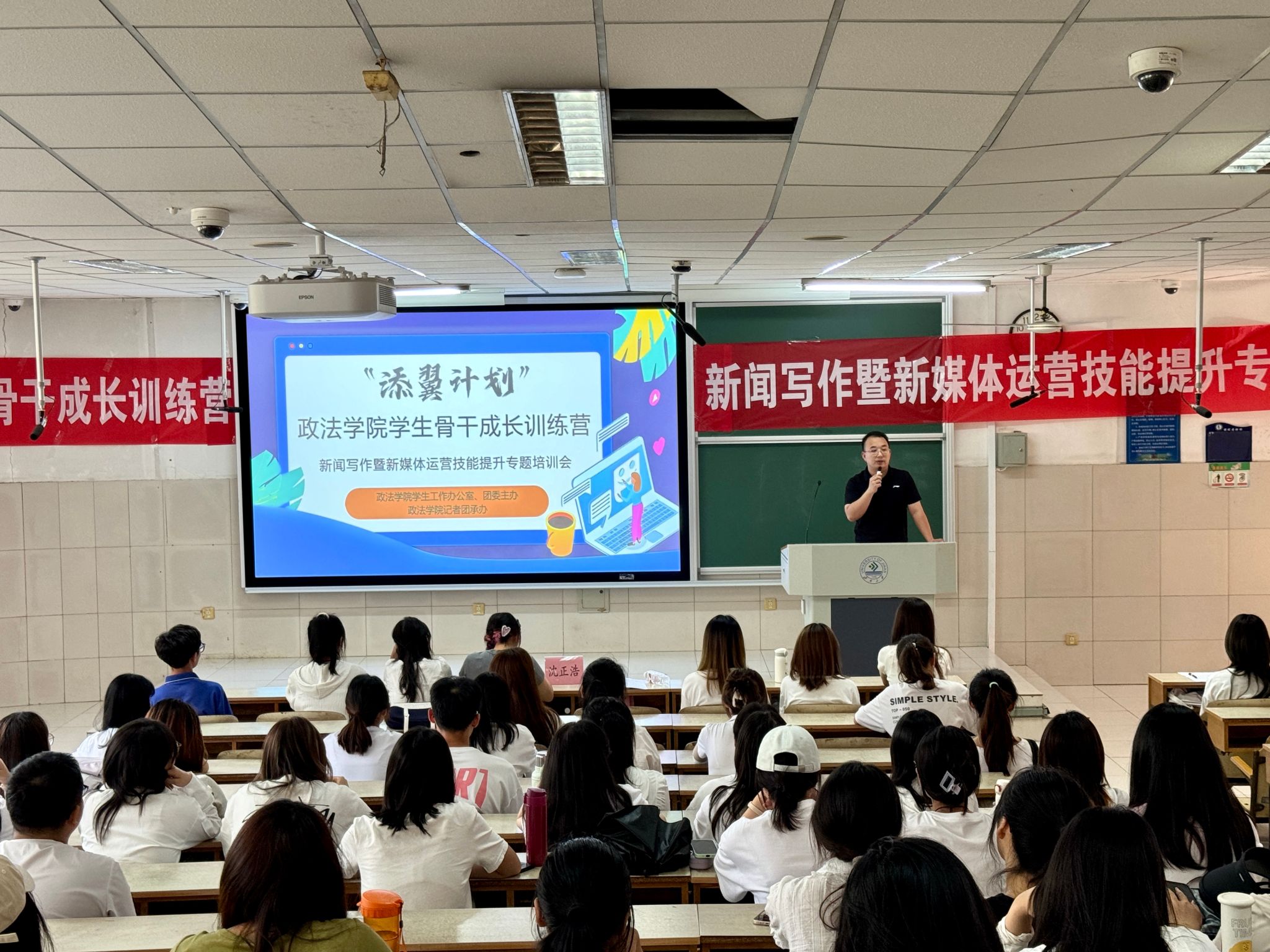 辅导员沈正浩老师讲话,他强调了新闻写作和新媒体运营在当今时代的重要性,并希望同学们能够珍惜这次学习机会,努力提升自己的专业素养。随后,李陈浩同学为大家带来了精彩的摄影和相机使用讲解。他通过生动的案例,向同学们传授了摄影构图、光线运用等技巧,并分享了自己在新闻摄影方面的经验和心得。孙于涵、贺嘉祎两位同学则为大家讲解了新闻采编技能。她们结合实际案例,详细讲解了新闻采访、写作、编辑等流程,并就如何提高新闻写作水平提出了宝贵的建议。最后,张景晰同学进行了公众号运营技能讲解。她介绍了公众号运营的基本原则和技巧,包括内容策划、排版设计、推广策略等。整场培训会同学们全程保持高度专注,认真记录着每一个细节。大家纷纷表示,通过这次培训会,不仅学到了很多实用的知识和技能,还拓宽了视野和思路。