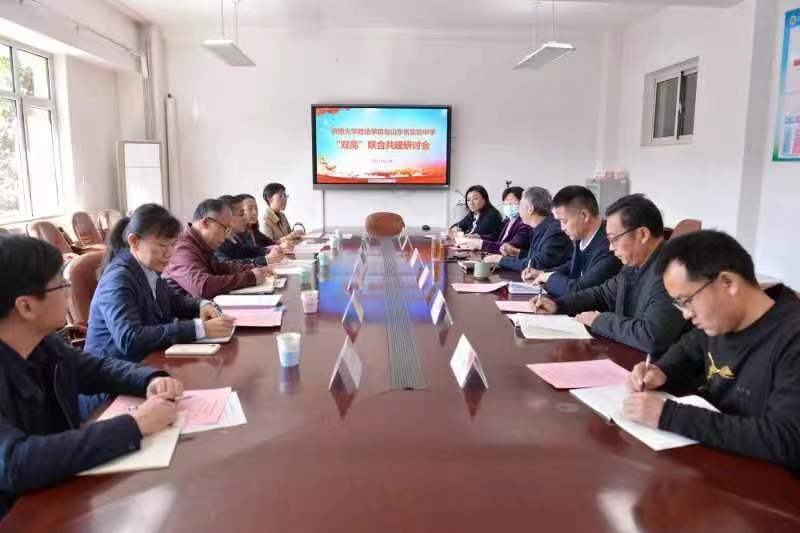 2023年3月29日上午,调研组一行6人受到了山东省实验中学的热烈欢迎和接待,并与相关领导和老师进行了富有成效的座谈。在座谈中山东省实验中学党委副书记何庆利、组织人事部主任高良元、教学管理部主任武彩先后发表了热情洋溢的讲话,并在“双高”联合共建引领创新协同育人方面,希望为人才培养搭建平台,促进共同发展。山东省实验中学思想政治学科组张建志、马斯亮、王伟三位备课组长根据思政学科的特点和要求,对思政专业的人才需求、人才培养、课程设置等内容提出了宝贵的意见和建议。双方同时就实习实践、党建合作和未来发展进行了磋商和研讨。
