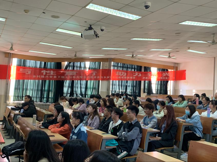 随后,陈小淋同学通过选择题的前测形式,知悉参会大学生对于农村性教育了解程度的同时,活跃了现场的活动气氛。紧接着,陈小淋同学通过介绍“女童保护”公益组织所发布的儿童性侵统计数据、儿童性侵危害的案例展示以及现场问答互动等多种宣讲形式,生动介绍了目前农村儿童性教育严重匮乏的社会现状和进行关注的重要性。陈小淋同学表示中国农村儿童性教育的发展任重而道远,希望通过此次宣讲会能够引起大学生群体对儿童性教育问题的关注,尤其是有知识、有思想的大学生们更多可以去关注农村儿童性教育,参与农村儿童性教育,让每一朵小小蓓蕾都不会被笼罩在性侵的阴霾下,让祖国的花朵在更阳光的世界上健康成长。讲座最后,参与活动的师生一起在宣传横幅前签名并合影留念。