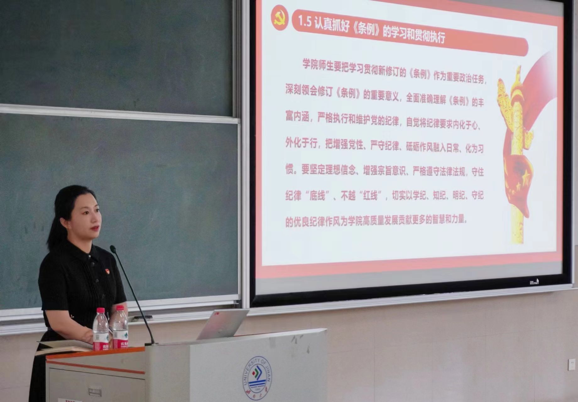 2024年上半年党员发展对象、入党积极分子讲授专题党课。党课以《学条例守纪律强党性做表率为全面推进中华民族伟大复兴贡献青春力量》为题,详细解读新修订的《中国共产党纪律处分条例》,引导青年学生高举中国特色社会主义伟大旗帜,争做有理想、敢担当、能吃苦、肯奋斗的新时代好青年,为实现中华民族伟大复兴的中国梦而不懈奋斗。参训师生结合自身学习、工作实际,畅谈感受体会,张帆、姜彤、巩昱杰三位同学分享了自己的入党故事。