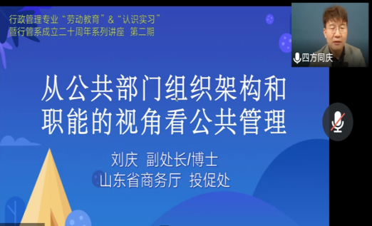 5月13日晚,行政管理专业20级“劳动教育”和“认识实习”暨系成立二十周年系列讲座第二期成功举行。本次邀请山东省商务厅投促处副处长刘庆担任主讲嘉宾。六合论坛