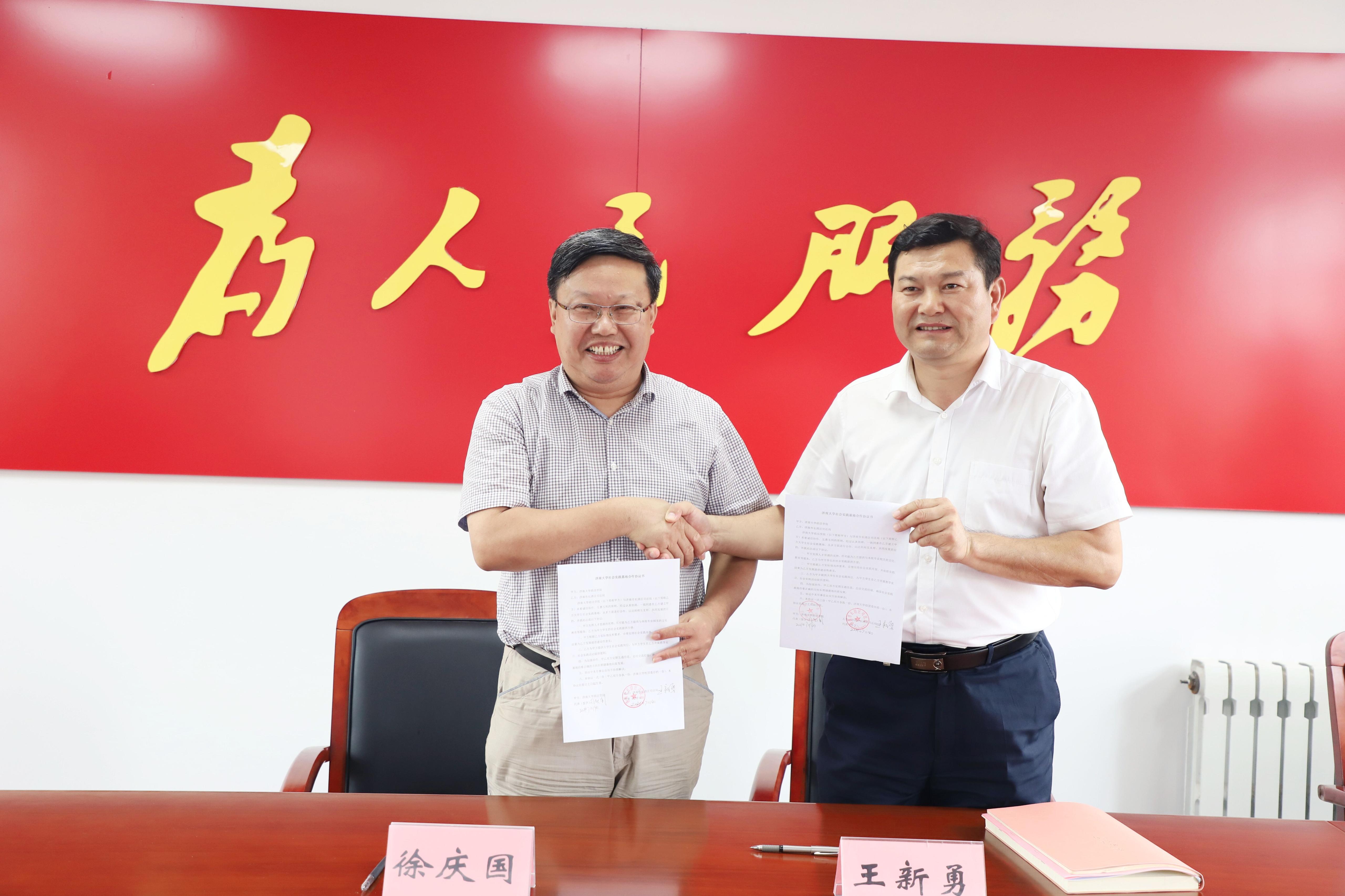 基本情况、师资队伍、学科建设、人才培养等情况进行介绍。王新勇局长与徐庆国书记签署合作协议并为社会实践基地揭牌。双方表示希望以社会实践基地的成立为契机,建立长期紧密合作,推进社会实践项目多样化、常态化,发挥双方优势,深化合作力度,拓宽合作领域,实现共赢发展。