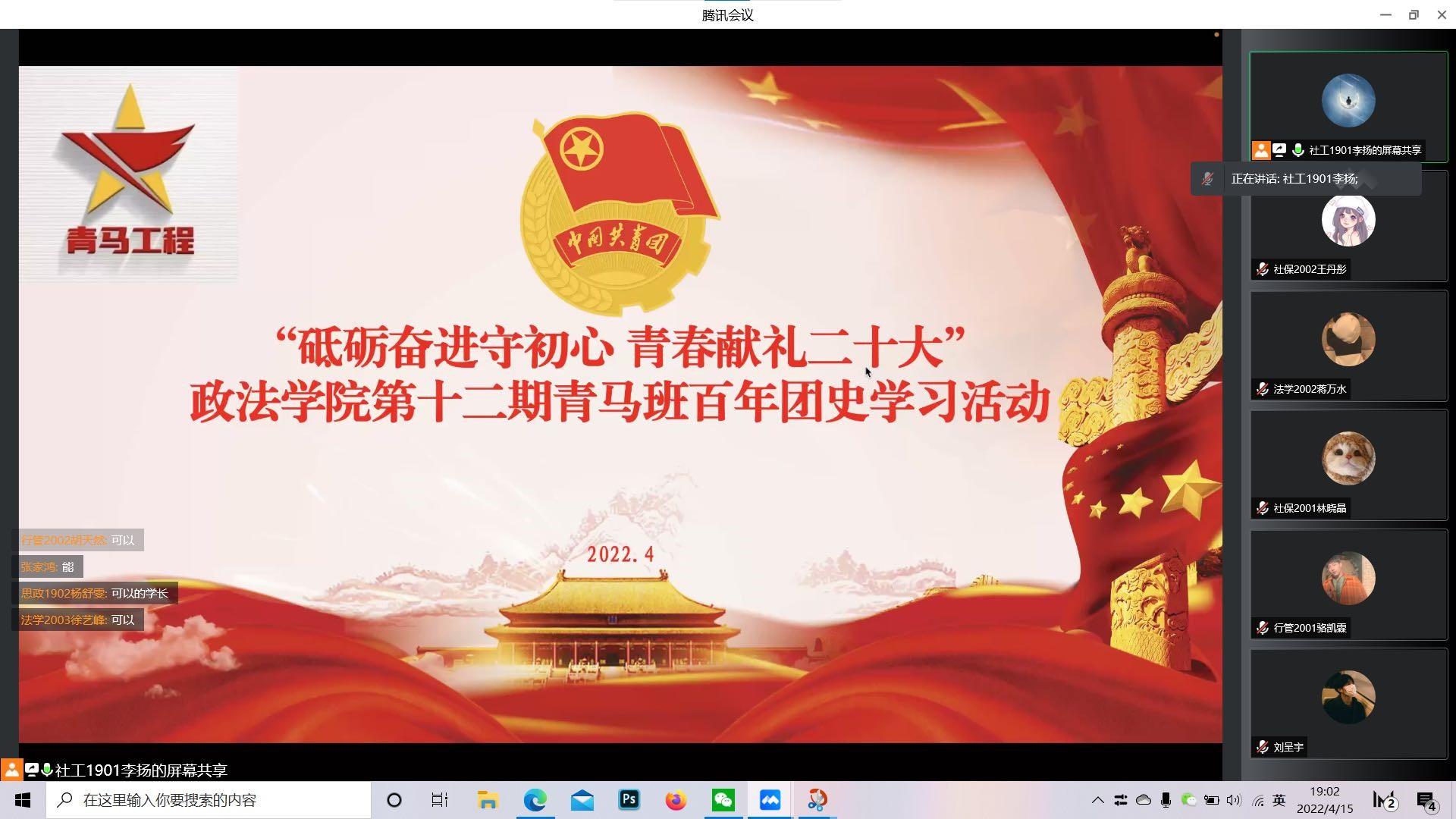 第十二期“青马工程”学生骨干培训班(以下简称青马班)应疫情防控要求,以线上视频会议的形式,开展了“砥砺奋进守初心 青春献礼二十大”百年团史学习活动。青马班全体成员参加,活动由青马班班长李扬主持。