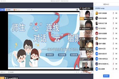通过视频会议形式举行了以“师生‘心’连线,对话‘云’相聚”为主题的线上师生面对面交流活动。党委书记徐庆国,院长梁丽霞,正处级组织员国迎春,党委副书记、副院长于龙泉、副院长李慧明、刘康磊,学办教办负责人及各年级辅导员老师出席此次活动。师生共六十余人展开了一次轻松愉悦的“云”相聚,活动由学办主任黄茜老师主持。