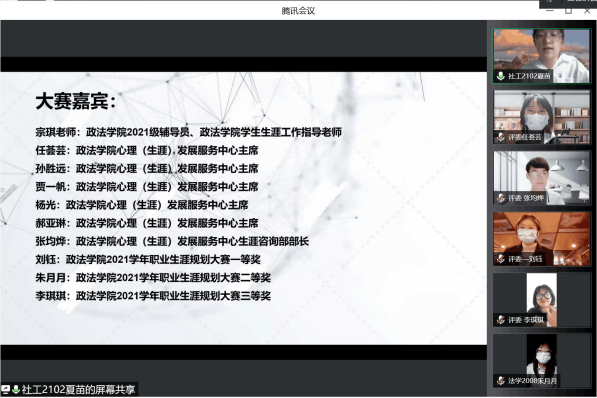 学生生涯工作指导老师宗琪老师进行指导,同时邀请到任荟芸、孙胜远、刘钰、朱月月、李琪琪、张均烨作为本次大赛的评委,各位参赛者和观众积极参与,活动通过答辩的方式进行。活动开始前主持人夏苗向大家介绍了活动的背景和目的。活动时各位评委根据选手的表现和作品做出点评并对选手的职业生涯规划及职业生涯规划书作品提出一定的意见与建议,对参赛人员的职业生涯规划的完善有重要指导作用,根据选手表现评分评选出了获奖选手并进行奖励。活动最后主持人和各评委总结活动意义,对同学们的职业生涯规划给予美好期盼和积极鼓励。