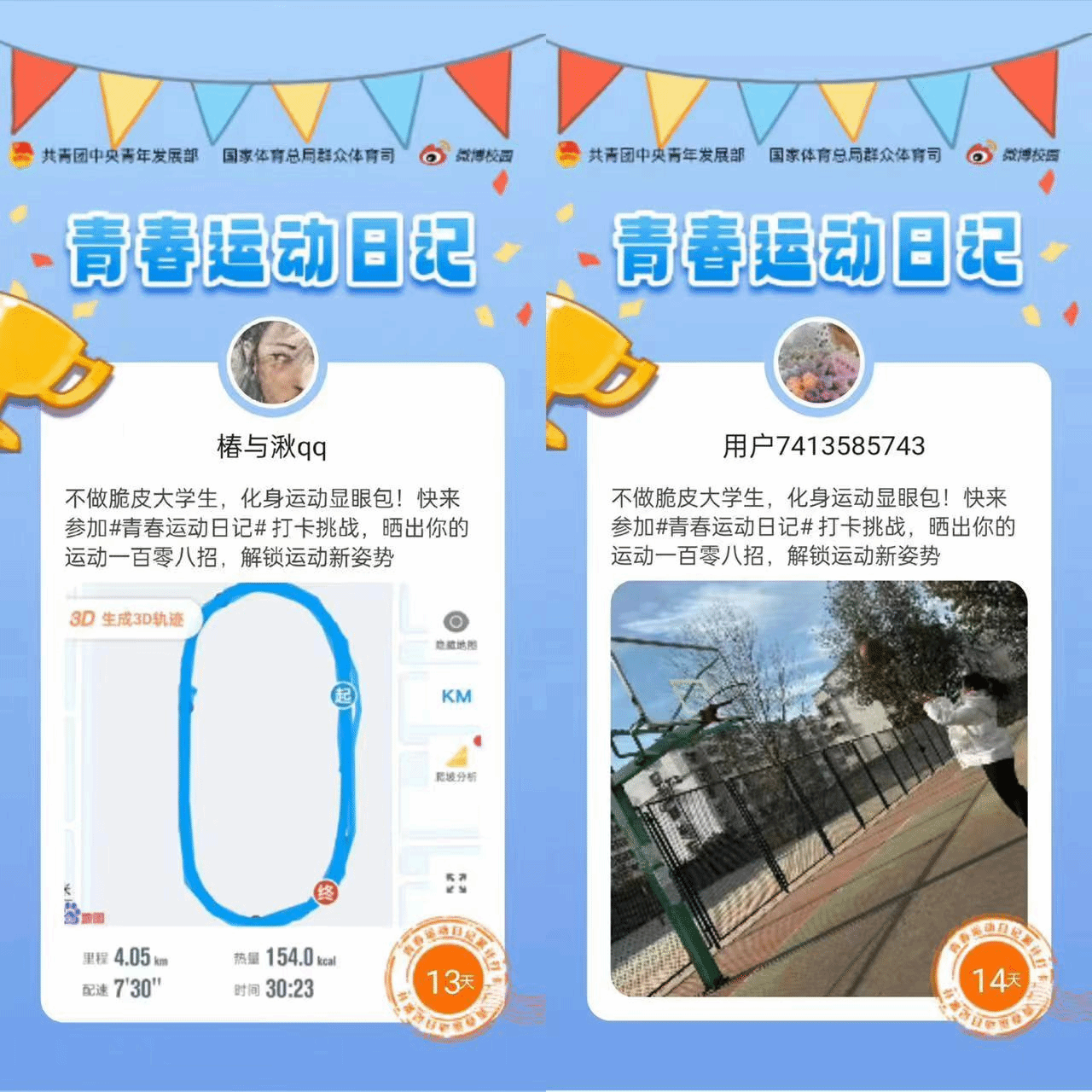 号召,开展了为期20天的“青春爱运动,健康强中国”——2023年“青春运动日记”大学生团员常态化运动打卡系列活动。
