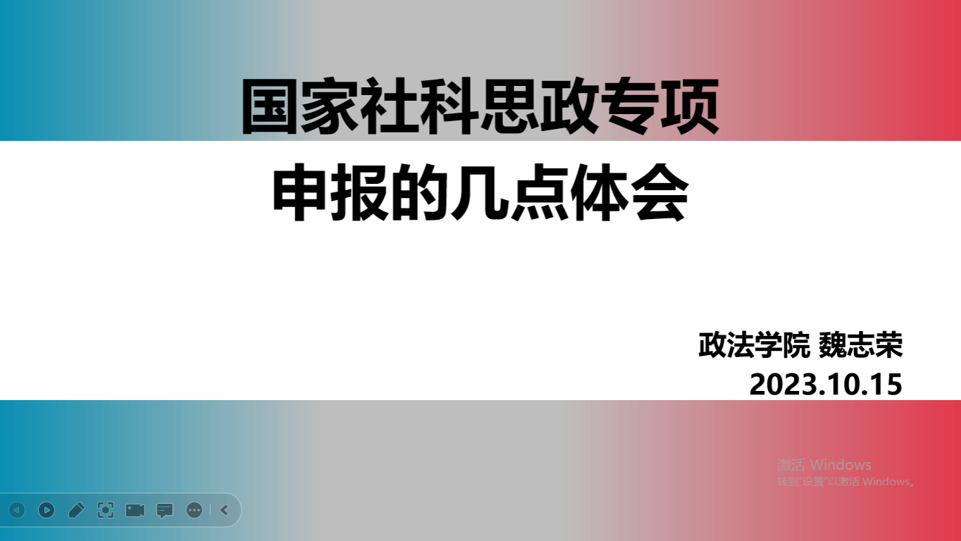 张晖副教授结合自身学习研究经历和申报国家社科思政专项的经验,从申报准备、确定选题、申请书撰写规范以及申报细节等多个方面介绍了国家社科思政专项申报要点与注意事项,并建议申报教师选题时应跟踪热点,找到合适的切入点和独特的研究视角。魏志荣博士从相关准备和基础、国家政策文件、历年立项分析、公告指南研究等方面谈了个人的体会和感受,并对国家社科思政专项与一般项目的不同之处进行了详细阐述,给未来即将申报思政专项的教师以借鉴。