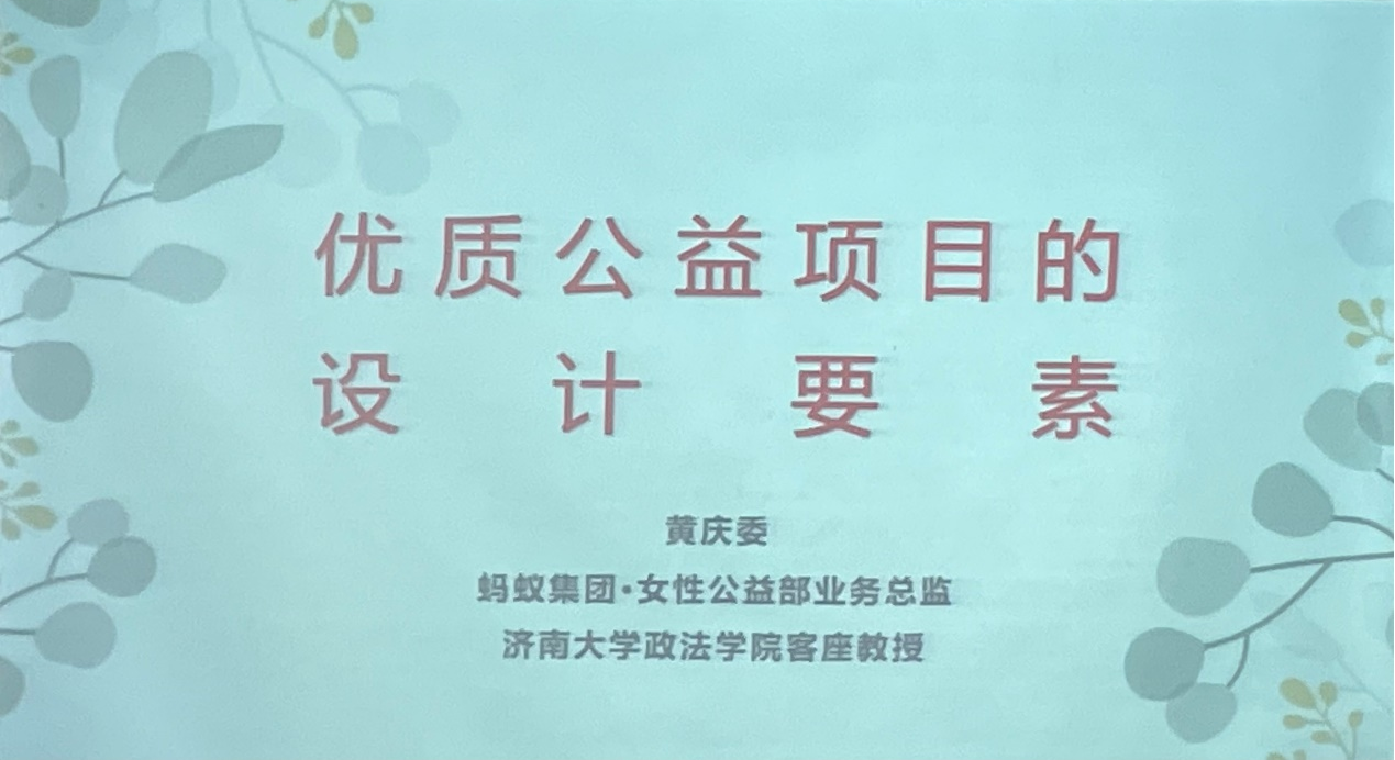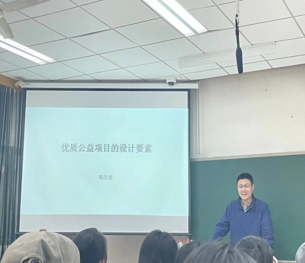 对学子黄庆委重返校园表示诚挚欢迎;随后,黄庆委总监向参会师生介绍了社会工作在国内蒸蒸日上的发展现状;紧接着,黄庆委总监从创造价值、需求导向、技术解决方案和组织运营四个维度,穿插生动的案例分析,深入浅出地阐述四要素的重要性和其在公益项目设计中的作用。黄庆委总监先从创造价值维度切入,指出公益项目是否创造价值首先要看其能否带来社会价值;公益项目应同时紧密围绕社会的需求导向展开,只有通过了解社会需求才可能得出最佳的解决方案,从而推动公益项目的成功;说到技术解决方案,黄庆委总监指出优质的公益项目设计不仅要有清晰的理论框架和核心设计理念,而且还需充分统筹考虑项目的可持续性;对于组织运营,黄庆委总监提出机构中的领导人、骨干团队、文化以及合规自律都是非常重要的。讲座最后,黄庆委总监为济大社工学子送出衷心祝福与鼓励。讲座取得圆满成功。
