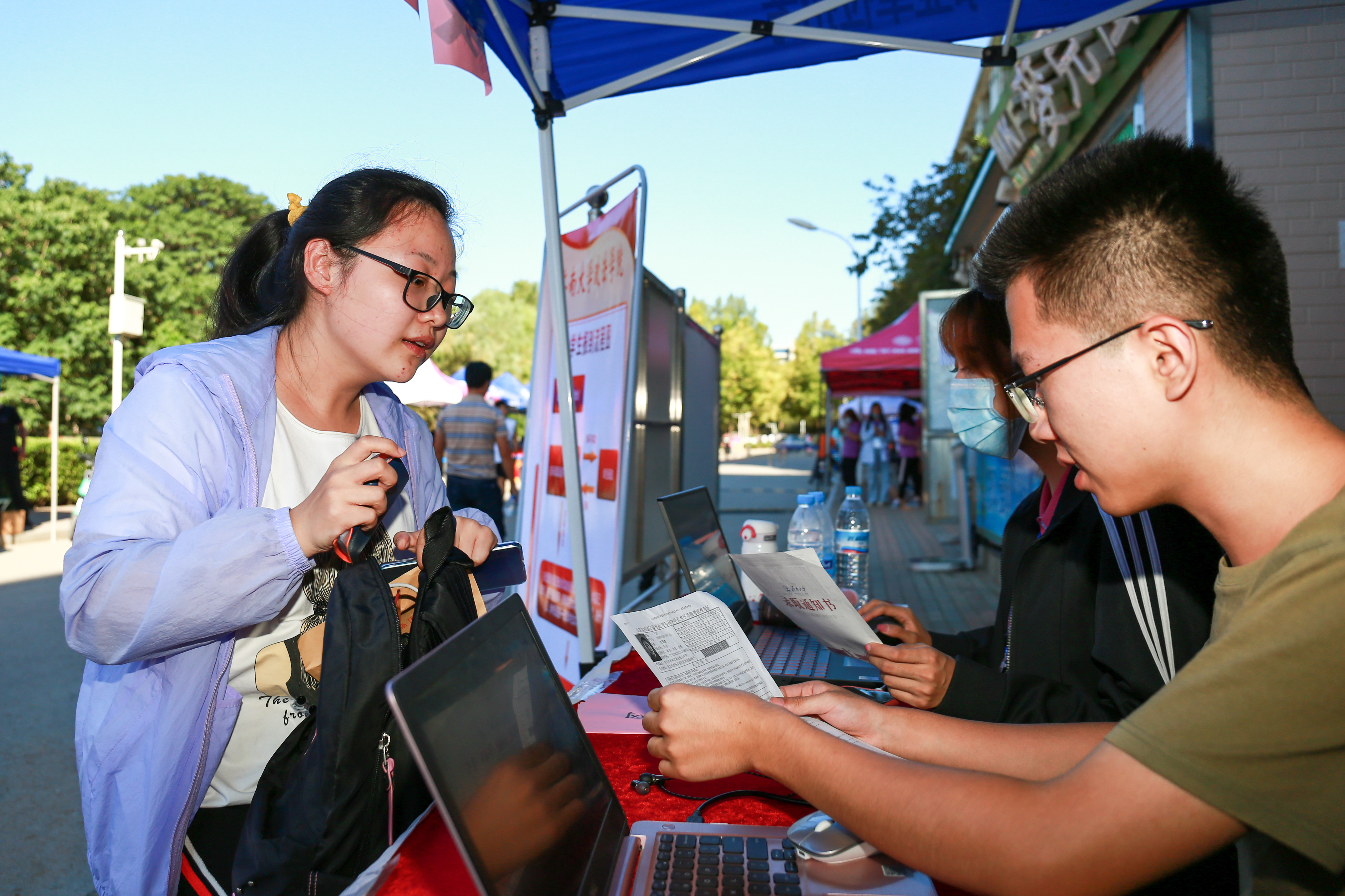 9月16日,清晨的新生接待处,师生代表和志愿者们早早地等候着新生的到来。接待处分别设立了迎新扫码站,为新生办理报到手续、发放报到材料、开展迎新活动,到处都是忙碌的身影。