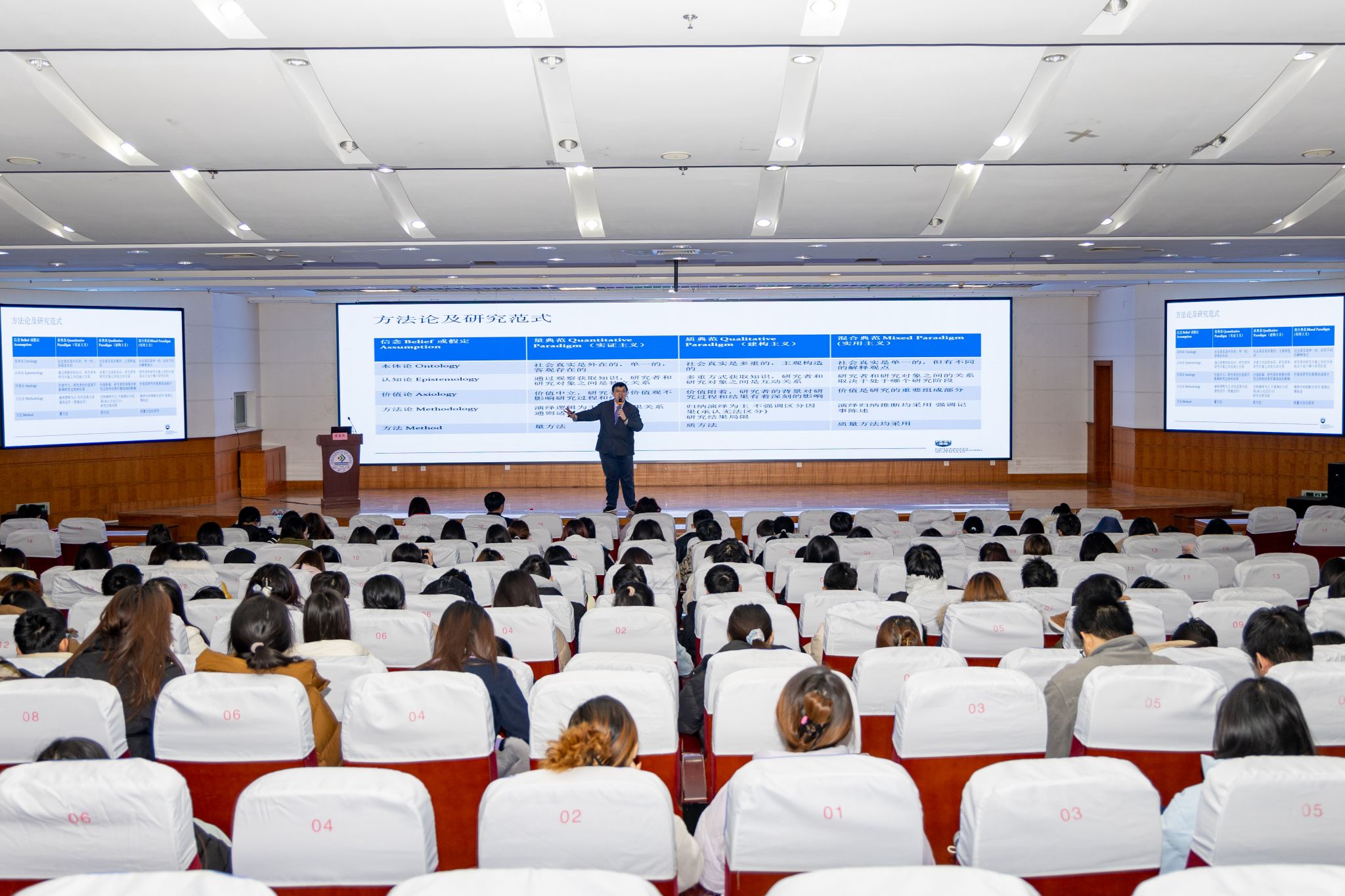 学术报告环节,黄泰然博士首先介绍了方法论的重要性及其演进过程,指出方法论作为关键的哲学概念,旨在描述人们观察与处理世界事务的方式手段,与科学发展的历史紧密相连;着重强调了方法论在理论构建进程中的关键意义,剖析了方法论及其研究范式的差异,明确定量研究与定性研究相辅相成的关系,进一步凸显了混合研究的重要价值。在此基础上,详细阐释了规范研究常用的理论及方法,总结了质性研究在实际应用中的重要地位,指出质性研究与实证研究相结合将有力推动学术研究与实践的协同发展,并进一步强调了跨学科研究在管理学领域的关键意义。最后,为师生提出了宝贵的学习建议,鼓励大家多读优质文献、扎实理论基础并熟练掌握数据处理方法,以快速提升个人能力。