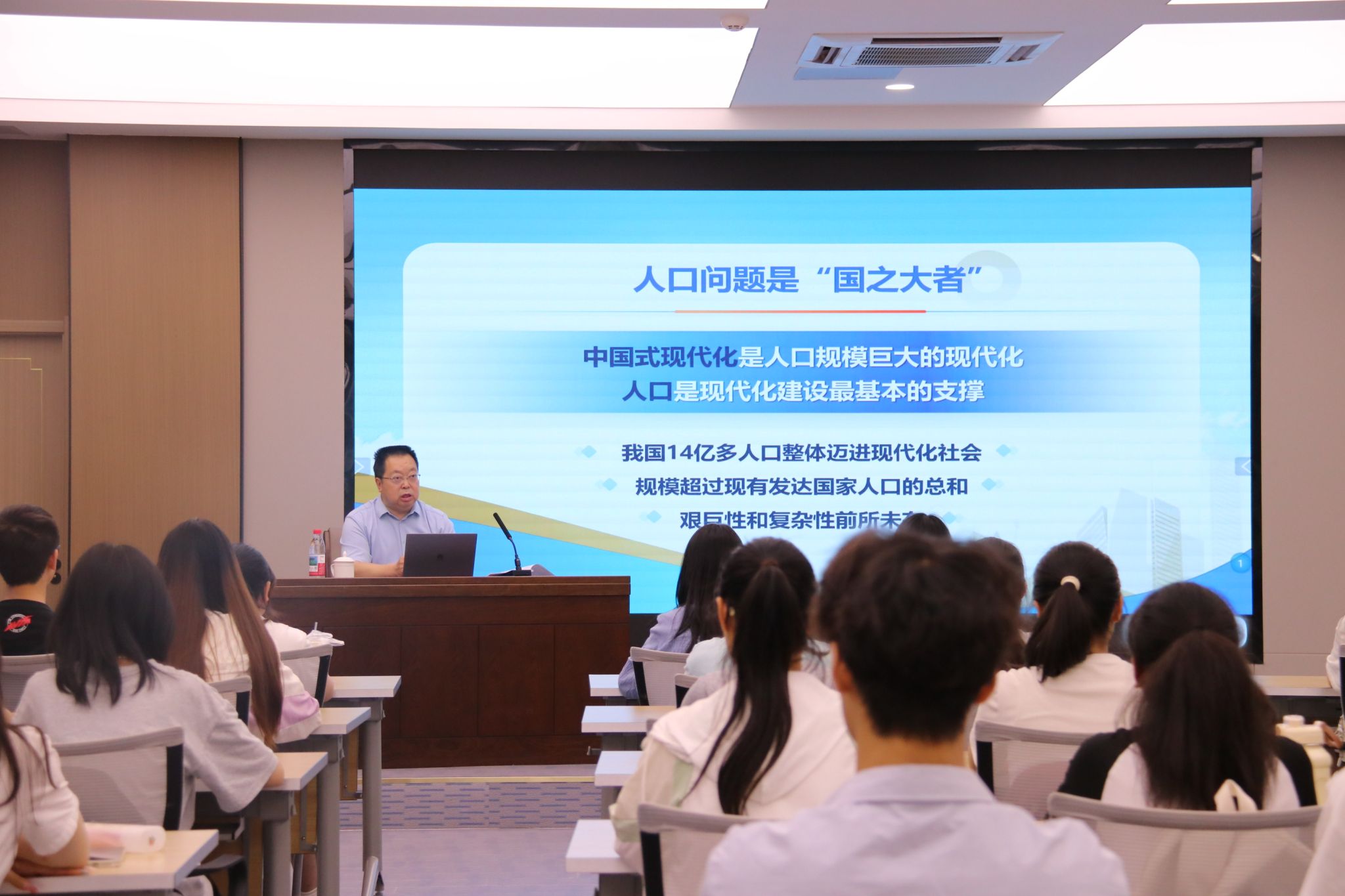 课堂上,刘宗明校长通过详实数据回顾了新中国成立以来的人口发展历程。他结合社区支持、“银龄行动”等案例阐释了社会工作专业在人口服务中的多元角色,勉励青年学子以“国之大者”的胸怀理解专业使命,在社区服务、基层治理中践行社会主义核心价值观。
