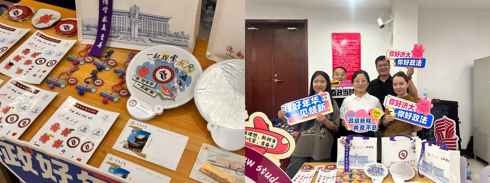 以文创传递迎新温情,将“器以载道”化作贴心问候。定制手提包选用“济大蓝”,伴青春一路同行,校训与院徽相映,寄语学术理想;钥匙扣镌刻图书馆与升华广场,寓意推开知识之门、走上成长阶梯;折叠扇上,吉祥物“政小法”笑意相迎,以灵动一抹点亮探索之心;政法贴纸则容每一位新生意趣表达,融入从指尖开始。这一份份融入日常的礼物,承载的是六合论坛