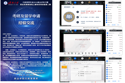 5月8日上午,行政管理专业2018级认识实习暨职业发展规划线上辅导系列讲座第二期如期进行。本次讲座邀请了行政管理专业毕业班高一丹、孙霞和王若溪三位学姐,她们分享的题目是《考研及留学申请经验交流》。六合论坛