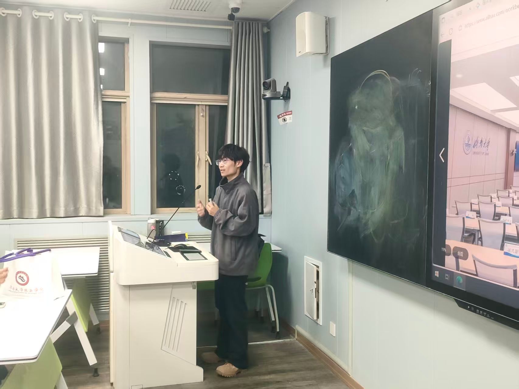 培训聚焦实战应用,以“理论+案例+互动”模式展开。李陈浩结合校园宣传场景,通过报告厅会议、校园活动等实拍案例,系统讲解构图逻辑、机位选择等实操技巧,针对感光度、白平衡、快门速度与光圈的核心参数搭配进行拆解演示,将抽象的摄影原理转化为可直接套用的实操方法。此外,他围绕“宣传摄影的沟通技巧”展开分享,强调拍摄需兼顾画面质量与现场秩序,尊重被拍摄对象,做到“技术服务于内容,细节彰显专业性”。互动答疑环节,针对“复杂光线环境曝光”“动态场景抓拍”等高频问题,李陈浩给出“优先锁定快门速度保障清晰度,灵活调整ISO与光圈,辅以后期精细化优化”的解决方案,精准回应同学们的实操困惑。