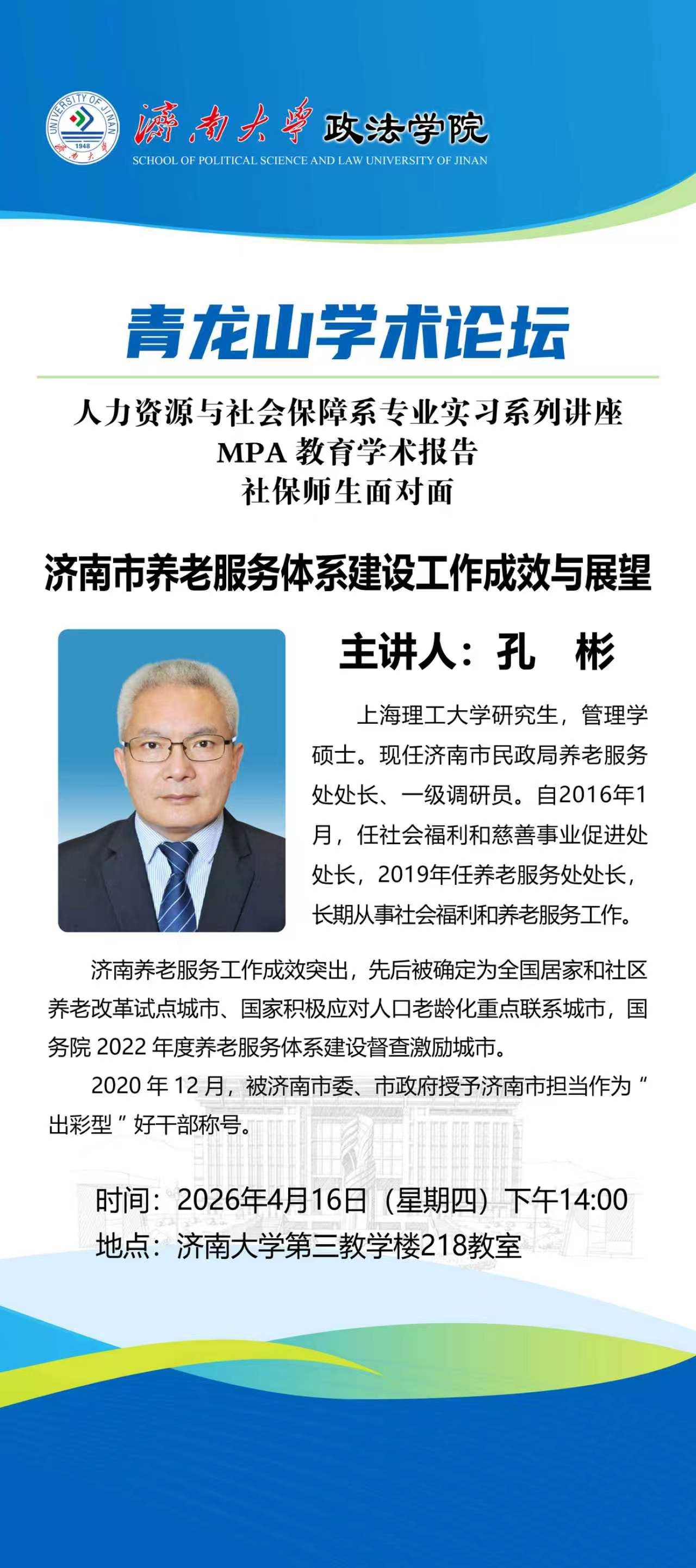 人力资源与社会保障系结合认识实习周安排,邀请济南市民政局养老服务处处长、一级调研员孔彬莅临六合论坛