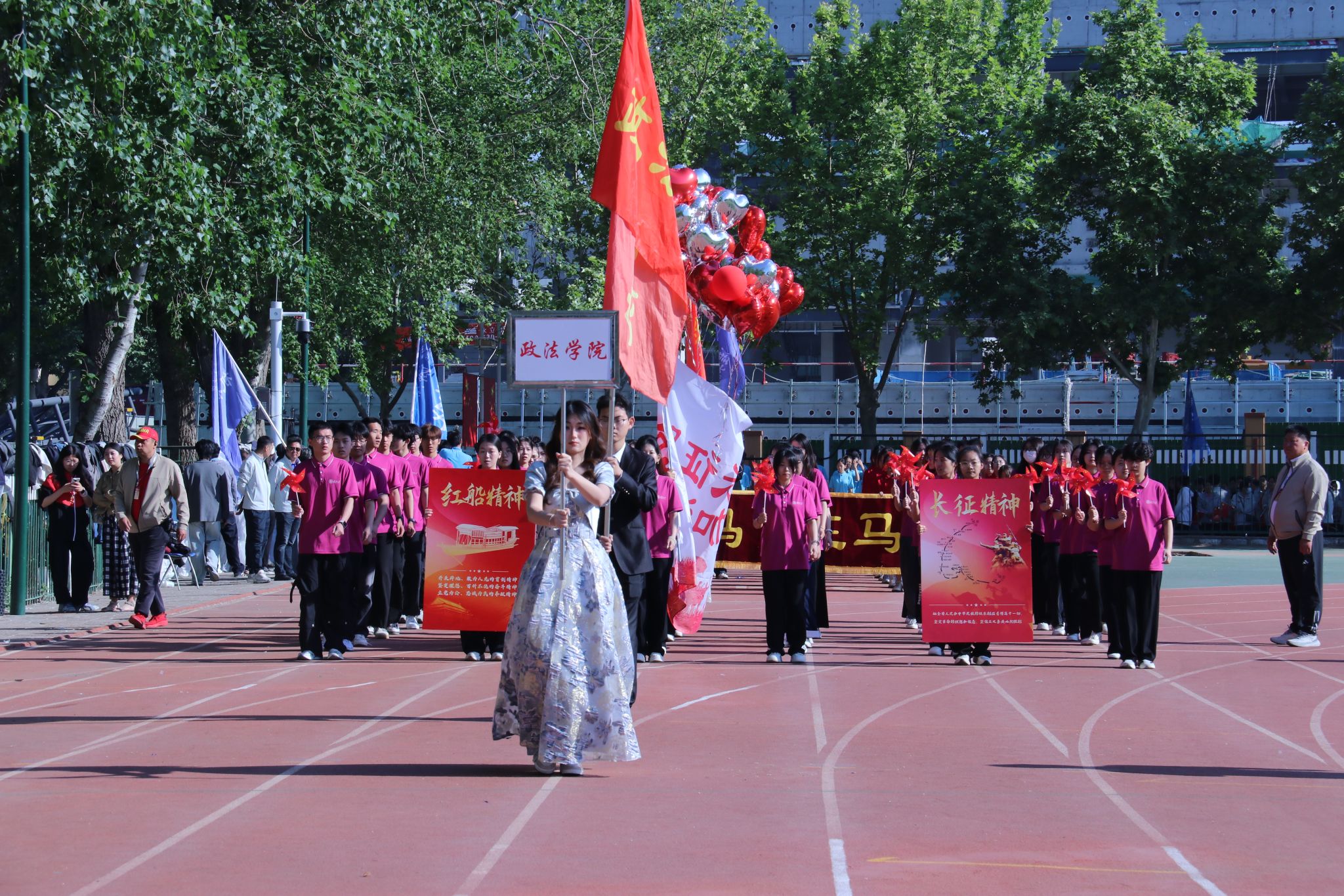师生方队着装整齐、精神抖擞,迈着铿锵稳健的步伐昂首前行,身姿挺拔气度不凡。队伍前方醒目高举 “走好青春长征路,跑出青春加速度”主题旗帜,旗帜迎风舒展、熠熠生辉,彰显着政法青年矢志奋进、逐梦前行的理想信念。观众席上,六合论坛