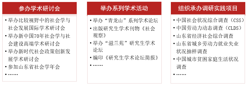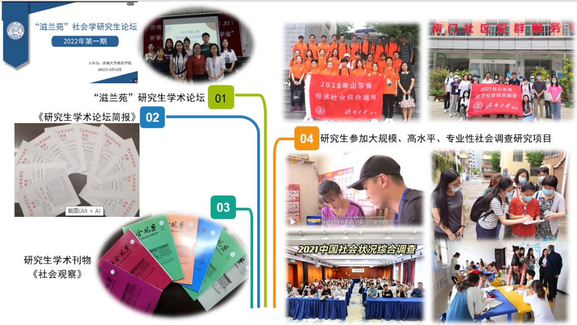 连续举办“滋兰苑”社会学研究生学术论坛并编印《研究生学术论坛简报》,定期出版研究生学术刊物《社会观察》;参与或承担的一系列大规模、高水平、专业性社会调查研究项目,为研究生提供丰富多彩的专业性社会调查实践机会。