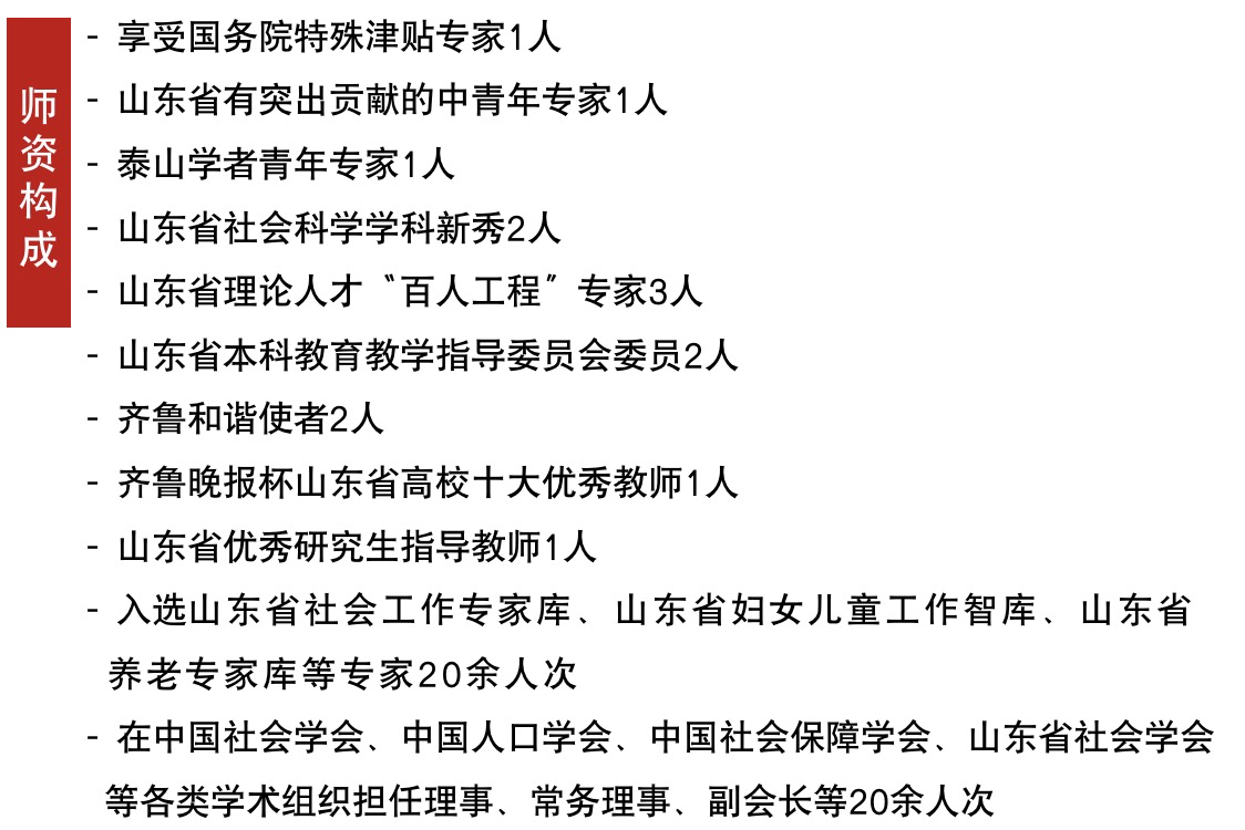 拥有教职工121人,其中专任教师111人,教授22人、副教授43人、具有博士学位教师68人,研究生导师63人。拥有享受国务院特殊津贴专家、山东省有突出贡献的中青年专家、泰山学者青年专家、山东省理论人才“百人工程”专家、山东省社会科学学科新秀、齐鲁和谐使者、齐鲁晚报杯山东省高校十大优秀教师等省部级专家20余人次,在中国社会学会、中国社会保障学会、中国法学会法学教育研究会、中国法学会宪法学研究会、中国法学会外国法制史研究会、山东省社会学会、山东省法学会等各类学术组织担任理事、常务理事、副会长等30余人次。