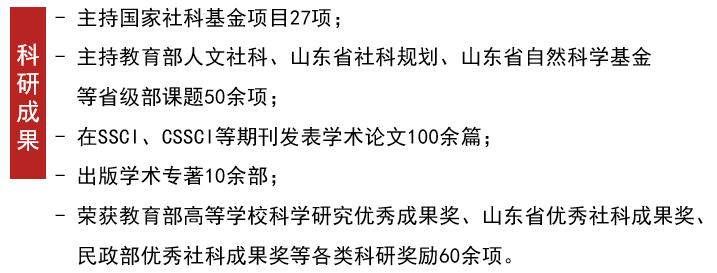 科学研究优秀成果奖1项,山东省社科优秀成果奖一等奖6项、二等奖10余项,其他省部级奖励20余项。承担省级和校级一流本科课程、精品课程、课程思政示范课程等20余门,出版教材20余部,获省级优秀教学研究成果奖6项。在校学生获国家级奖励20余项,省部级等奖项百余项。