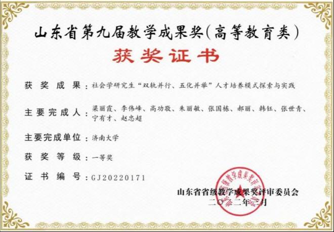 ◎建立起社会学研究生“双轨并行、五化并举”的人才培养模式,该教改成果获山东省第九届教学成果一等奖