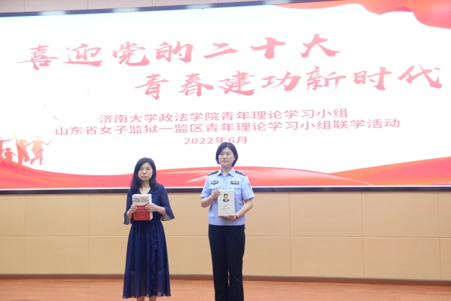 法学系党支部的党员老师齐晓霞、侯中华、张雯、朱海波、薛静丽组成了青年理论学习小组与山东省女子监狱一监区的青年理论学习小组开展“喜迎党的二十大 青春建功新时代”主题联学活动。
