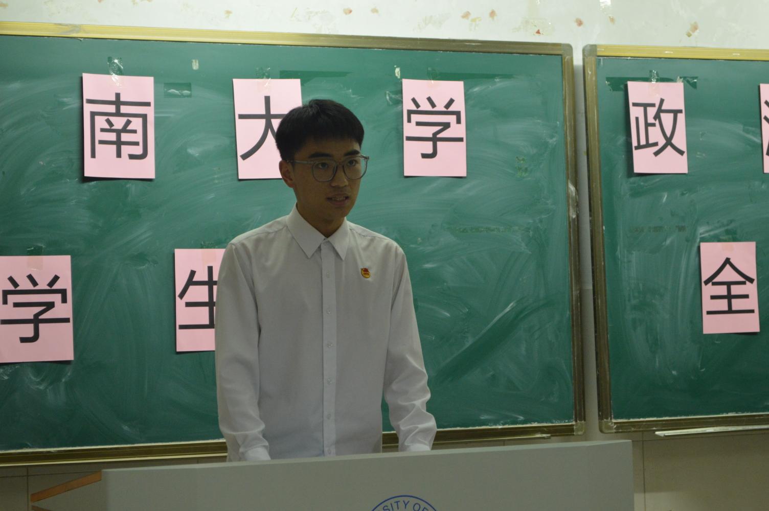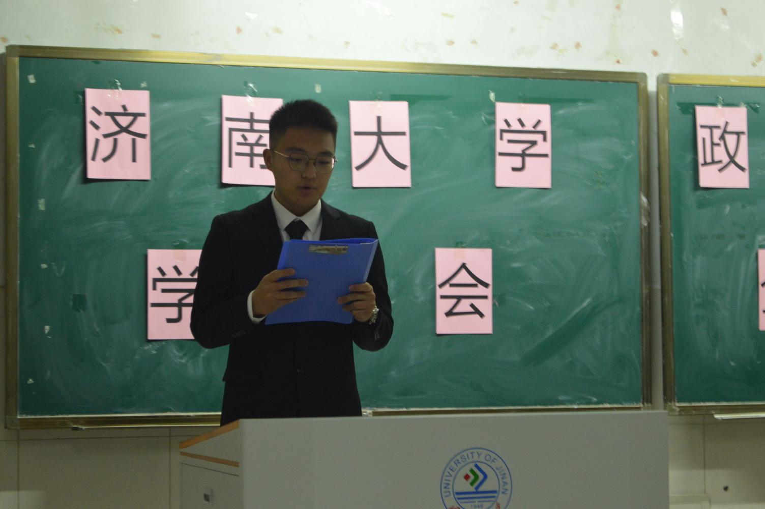 第二十二届学生会成员孙硕宣读学生会全委名单。宣读结束后,由干事代表巩昱杰进行发言,他表达了对学生会各项活动表示期待,对老师和学长学姐们的帮助与鼓励表示感谢,同时表明在今后的工作中将务实肯干,更好地服务广大同学。