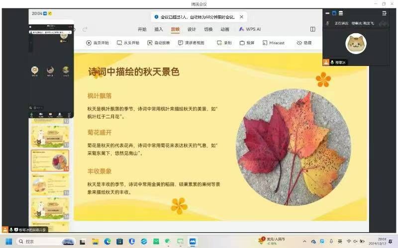 活动初始,志愿者根据当前的时间节气,精心挑选了古诗《秋词》作为教学内容,意在体现诗词文化与生活的紧密联系。他们通过生动的语言,详细解读了《秋词》的诗意,逐句分析诗句的优美之处,并通过图文并茂的讲解方式,将诗中“自古逢秋悲寂寥,我言秋日胜春朝”的豪迈情感娓娓道来,让学员们深刻感受到诗人的情感世界和人生抱负。学员们仿佛置身于诗中的秋日美景之中,尽情领略诗人对秋天的热爱和赞美。接着,志愿者们带领朗读古诗,让学员进一步感受诗词的韵味,在潜移默化之中,培养学员对诗词的热爱,加深对传统文化的理解与认知。此外,志愿者们还拓展了秋天的相关知识,进一步激发了学员们对瑰丽山河的好奇心和探索欲。